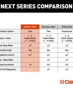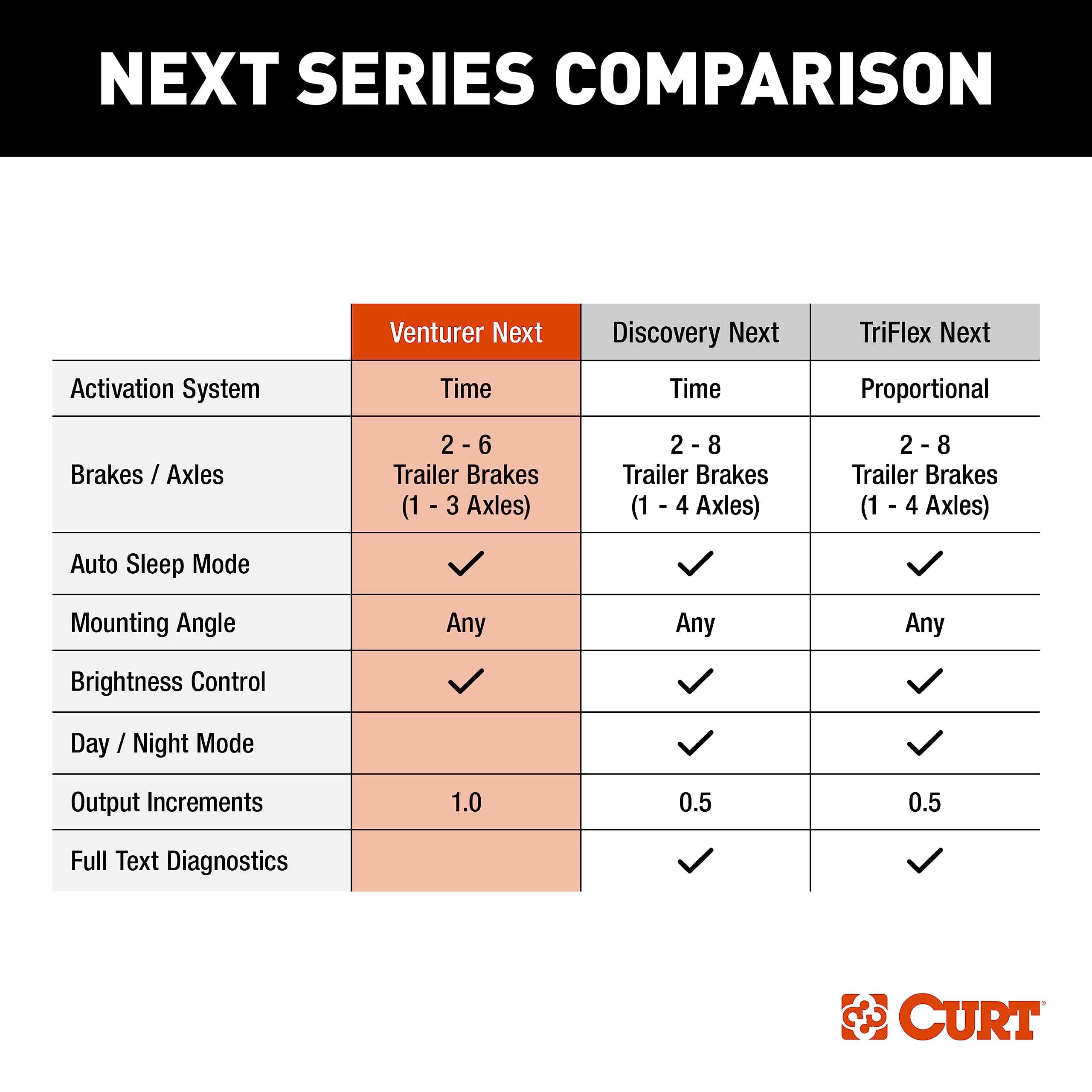 Experimente la confiabilidad y eficiencia del CURT Venturer NEXT, un controlador de frenos intuitivo y compacto diseñado para garantizar el funcionamiento confiable de sus frenos eléctricos para remolque directamente desde la cabina de su vehículo. Con un diseño elegante y moderno, este controlador avanzado está equipado con un soporte de perfil bajo que agrega espacio libre para una funcionalidad mejorada. Con la capacidad de controlar 2-6 frenos de remolque a la vez (1-3 ejes), ofrece configuraciones totalmente ajustables para adaptarse perfectamente a su configuración única de vehículo-remolque. El Venturer NEXT es una versión rediseñada y mejorada de nuestro popular controlador de frenos Venturer, que ofrece compatibilidad con frenos de bajo voltaje, PWM, ABS, control de crucero y frenos eléctricos sobre hidráulicos. Su perfil delgado proporciona una estética funcional y contemporánea, permitiendo un control de frenos potente al alcance de su mano sin dominar el tablero de su vehículo. La pantalla LED muestra convenientemente los ajustes de potencia en incrementos de 1.0, permitiéndole verificar rápidamente sus configuraciones, y el brillo es ajustable para una visibilidad óptima durante el remolque diurno o nocturno. Además, el soporte de montaje único incluido mejora aún más el espacio libre, asegurando una instalación perfecta y discreta. Equipado con una función de retardo de tiempo, el controlador de freno Venturer NEXT proporciona potencia y tiempo de rampa totalmente ajustables. Elija entre una amplia gama de 10 ajustes de ganancia y nueve ajustes de carga para adaptarse perfectamente a sus requisitos específicos de remolque. El progreso de rampa se muestra claramente a través de indicadores LED, y el brillo puede ajustarse para adaptarse a las condiciones de remolque diurnas o nocturnas. Este controlador de freno basado en el tiempo es rápido y fácil de configurar, sin piezas móviles internas o nivelación requerida. Ofrece opciones de montaje versátiles, lo que permite la instalación en cualquier ubicación y ángulo deseado dentro de su vehículo. Para una instalación plug-and-play conveniente, se recomienda utilizar un arnés de cableado de controlador de freno CURT (se vende por separado).