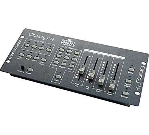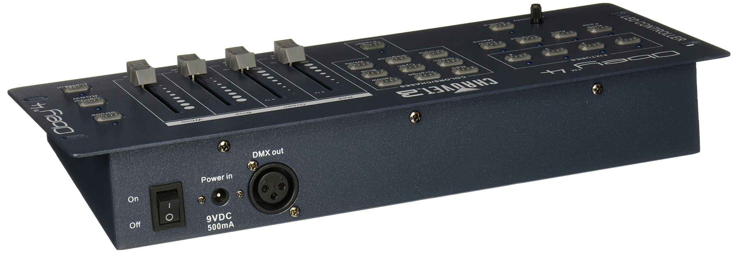 Es un controlador DMX compacto para luces LED de lavado con modos de 3 o 4 canales en rojo, verde, azul y blanco/ámbar para un fácil control de mezcla de colores. Cuenta con opciones de reproducción automatizadas, activadas por sonido o manual, y puede controlar accesorios en cuatro zonas diferentes de forma independiente. Sus botones de un solo toque de colores premezclados, chase incorporados y controles de estrobo y dimmer lo hacen perfecto para un principiante en iluminación o cualquier persona que busque una forma sencilla de controlar luces LED de lavado.