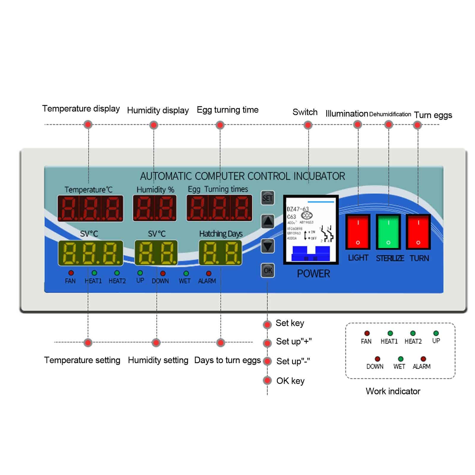 3. MICRO-PROCESAMIENTO AUTOMÁTICO INTELIGENTE: Este controlador de incubadora de huevos adopta nuevos componentes electrónicos, con volteo de huevos totalmente automático y tiempo de volteo libremente ajustable. Alarma totalmente automática, control de temperatura, control de humedad, enfriamiento y ventilación.