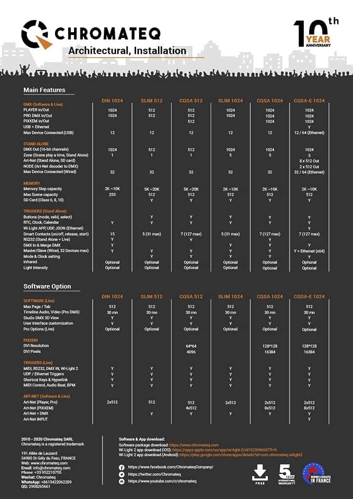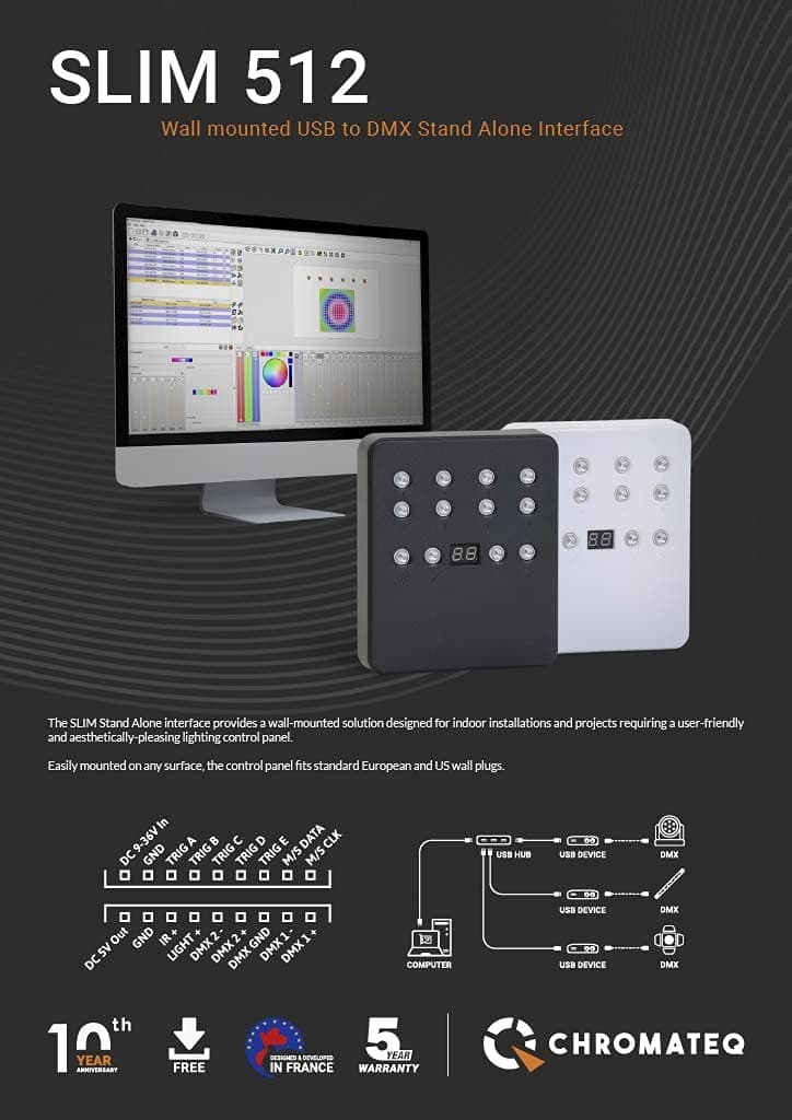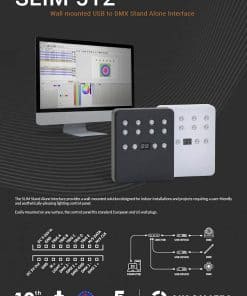 Controlador de Interfaz USB DMX Montado en Pared Chromateq SLIM 512 El interface SLIM 512 Stand Alone es el paquete ideal de software de control DMX512 para todas las instalaciones y proyectos en interiores. Puede ser fácilmente montado en la pared en cualquier superficie. En el lado frontal, los botones de interruptor mecánico y la pantalla LED utilizan un agradable LED de color azul profundo. Todas las conexiones están dentro de la carcasa y puede adaptarse a los estándares de enchufe de pared de Europa y EE. UU. El SLIM 512 es compatible con todo el software de Chromateq y puede integrarse en sistemas de control escalables diseñados para presentaciones en vivo o instalaciones fijas, o desplegarse individualmente sin necesidad de una computadora como una solución de control independiente elegante pero sofisticada. Cuando se conecta a una computadora, el control remoto del software está disponible a través de dispositivos Android e iOS con la aplicación Wi-Light 2 de Chromateq, con otras opciones de activación en vivo que incluyen MIDI, RS232, UDP/Ethernet, Teclas de Acceso Directo, Ritmo de Audio y BPM. El SLIM 512 permite controlar universos Art-Net a través del puerto Ethernet de red de una computadora conectada. Características Principales: Controlador DMX Live & Stand Alone 512 Canales DMX en modo Live 512 Canales DMX en modo Stand Alone 1 Universo Art-Net en modo Live corriendo LED Player o Software Pro DMX Función Art-Net + DMX: Reproduce 1 universo DMX + 1 universo Art-Net (2 universos en total) Compatible con Software LED Player, Pro DMX & Studio DMX Memoria Stand Alone Capacidad de pasos: 20K a 5K pasos Capacidad Máx de Escenas 512 Carcasa de perfil delgado montada en la pared (19 mm) Lector de Tarjeta SD (soporta todos los formatos FAT, SD Clase 10, hasta 256 GB) (Tarjeta SD no incluida) Contenido del Paquete: Interfaz DMX Software Incluido (Descargable) – Windows, Mac OS X & Linux Cable USB a Mini USB Mini desarmador plano