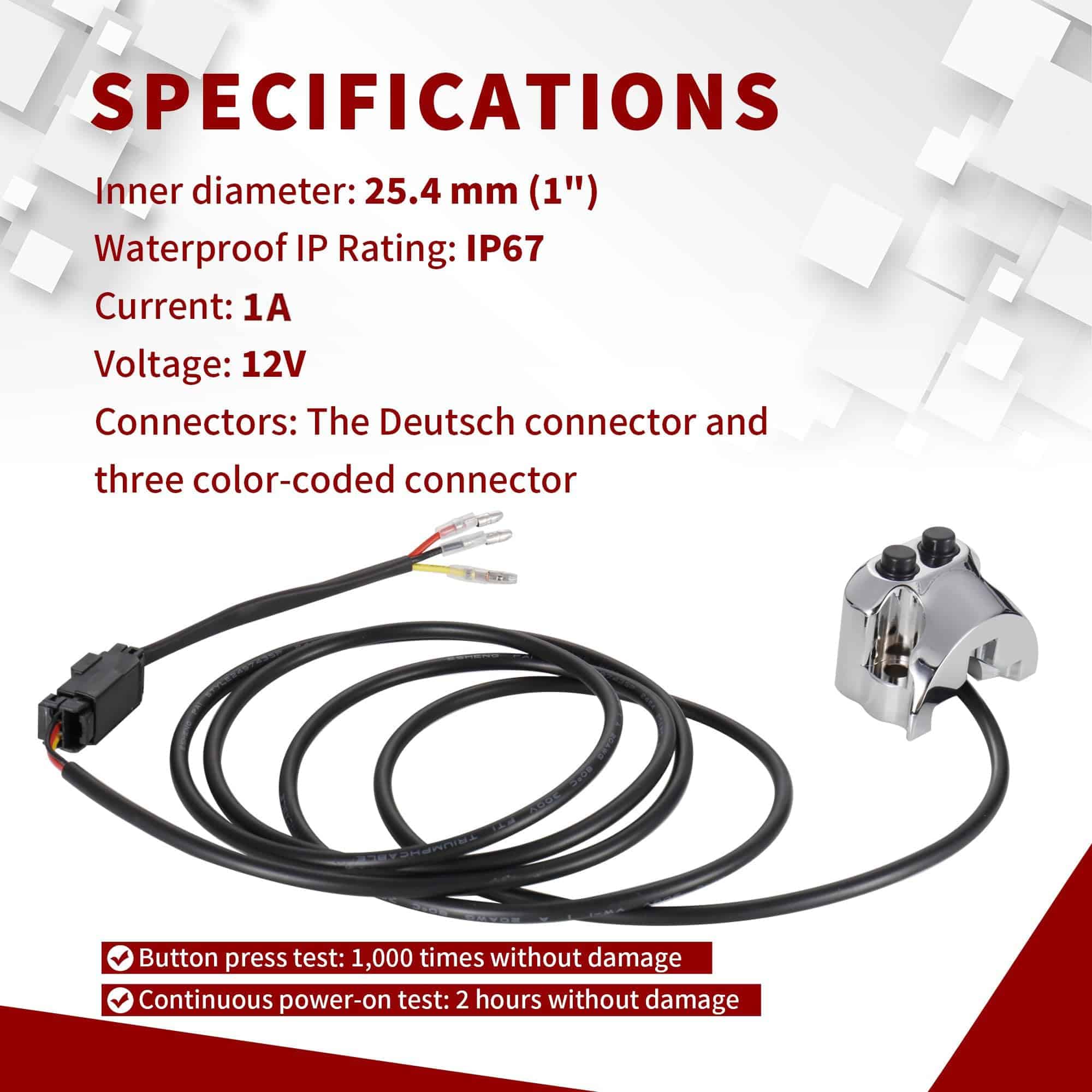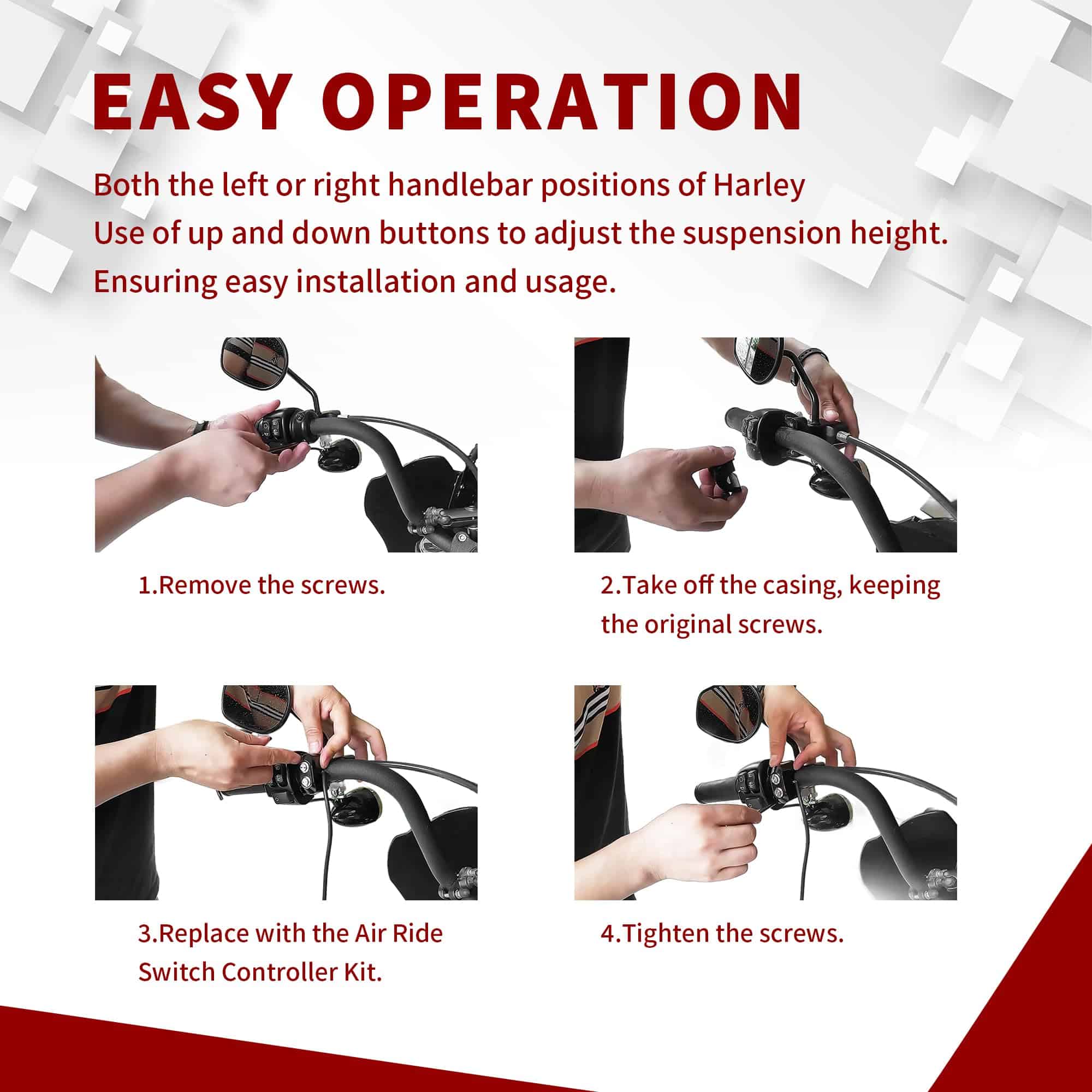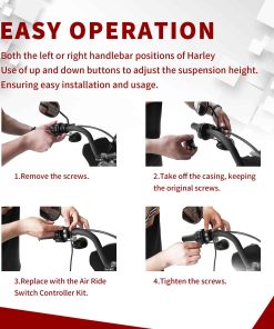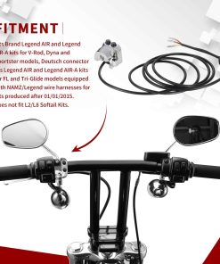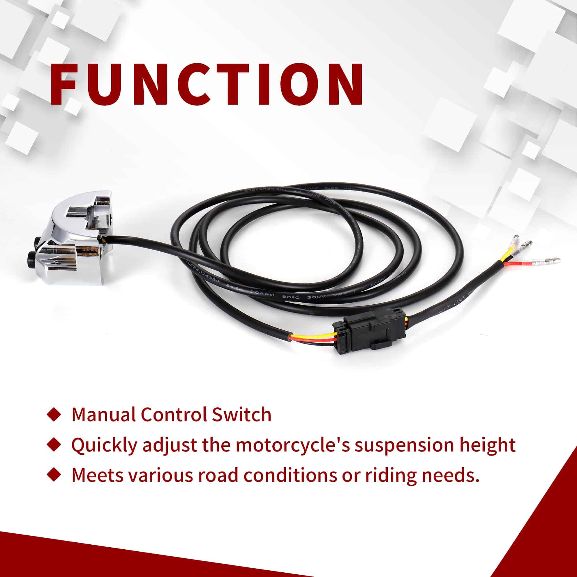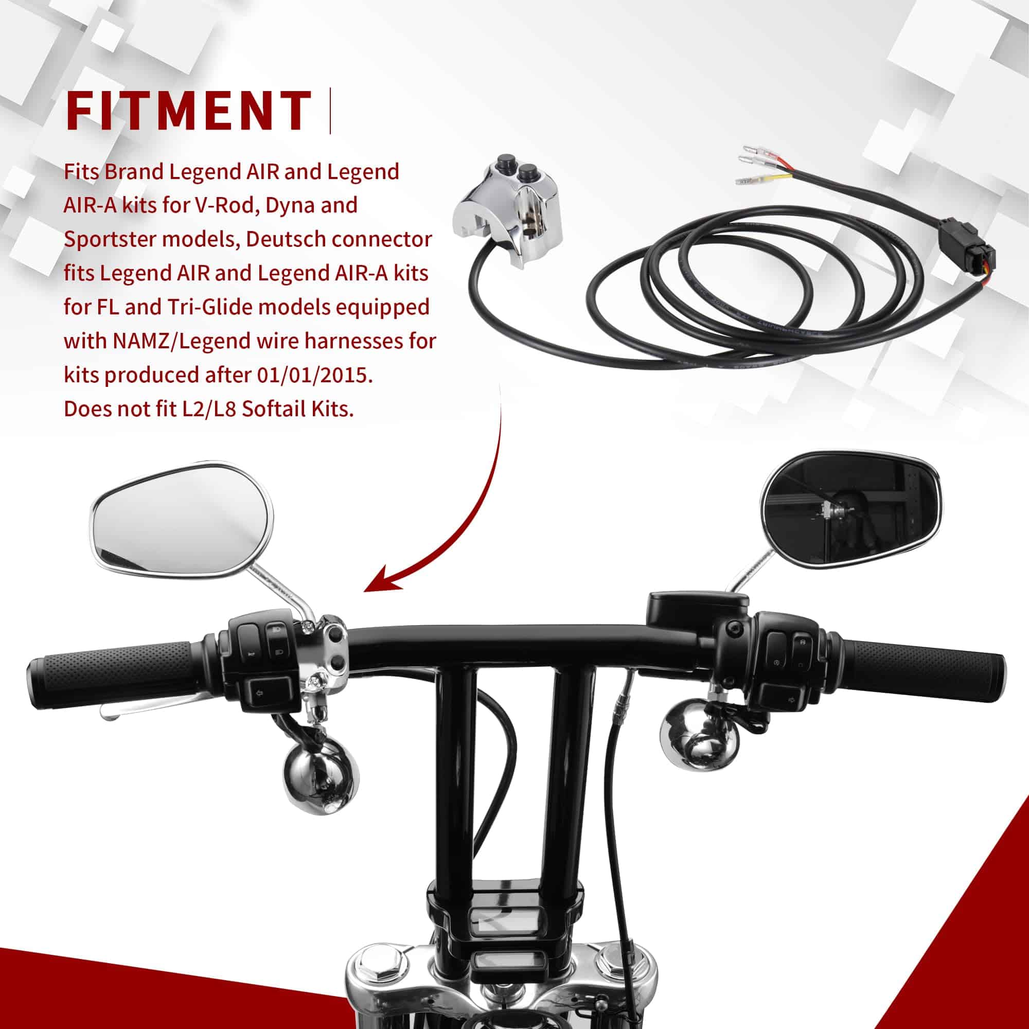 Modelos de Vehículos Compatibles 1 Handlebar Harley Dyna & V-Rod & Sportster con Modelos AERO, AERO-A (no apto para kits Softail L2/8 especificación Color: Negro/Chrome Lista de paquetes 1 Harley Handlebar Kit de Control de Interruptor de Suspensión de Aire Nota 1. La carga máxima del interruptor no debe exceder 1 amperio, cualquier carga mayor a 1 amperio requiere una conexión de relé. 2. No se ajusta a los kits L2/L8 Softail.