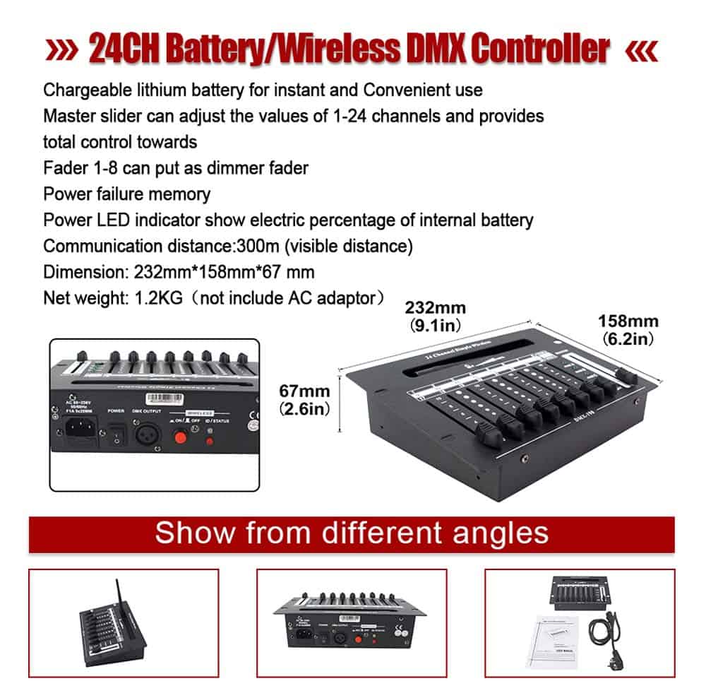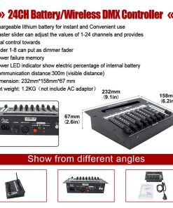 Control Deslizante Maestro puede ajustar los valores de 1-24 canales y proporciona control total. El fader 1-8 se puede usar como fader de atenuación. Memoria de fallo de alimentación. Indicador LED de potencia muestra el porcentaje de batería interna. Distancia de comunicación: 300 m (distancia visible). Dimensión: 232 mm 158 mm 67 mm. Peso neto: 1.2 kg (no incluye el adaptador de corriente). Características: Fácil de transportar, modelo compacto y fácil de instalar. Diseño único, ahorro de energía, larga vida útil. Aumente los efectos al operar simultáneamente cada luminaria en diferentes modos de reproducción con tiempos de atenuación variables. Deslizadores de velocidad y atenuación para crear una escena. Lista de Productos: Controlador: 1PC Cable de alimentación: 1PC Manual de Usuario: 1PC Garantía: Con certificados CE y Rohs, garantía de calidad. Si surge algún problema con esta luz móvil, no dude en contactarnos. Garantía de calidad de 1 año. Acerca de Nosotros: V-Show comenzó en 2010, hemos estado en el negocio durante 10 años. Vendemos productos de iluminación LED de alta calidad. Nuestro objetivo es brindar a nuestros clientes lo mejor por su dinero de forma fácil, segura y conveniente.