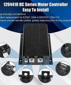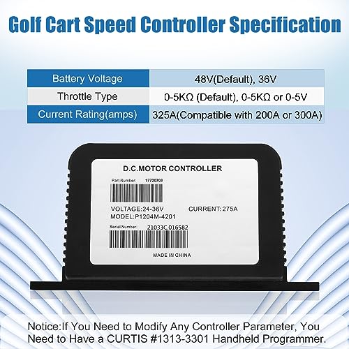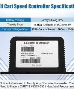 Más sobre este Controlador de Velocidad para Carritos de Golf 1204-410 / 1204-412: Voltaje de la batería: 48V (configuración predeterminada), 36V Tipo de acelerador: 5K-0 (configuración predeterminada), 0-5K; o 0-5V Clasificación de corriente (amperios): 325A (Compatible con 200A o 300A) Clasificación de corriente de 2 minutos (amperios): 325 Clasificación de corriente de impulso de 5 segundos (amperios): 358 Clasificación de corriente de 1 hora (amperios): 140 Frecuencia de operación PWM: 15.6 kHz Aislamiento eléctrico al disipador de calor (mín.): 500 VAC Frenado de enchufe (Barra de bus A2): Sí Si necesita modificar algún parámetro del controlador, necesita tener un programador manual CURTIS 1313-3301. Si su controlador de motor no es de 48V/5K-0/200A (o 300A), si no está seguro si el artículo es compatible con su auto, por favor proporcione la imagen de su parte original a nosotros.