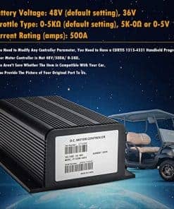 El controlador programable 1205 está preconfigurado en fábrica con parámetros de 48V, 500A, 0-5K . Cualquier desviación de estos valores preestablecidos puede resultar en una falla operativa. Así que confirme cada parámetro antes de hacer el pedido. Este controlador es incompatible con sistemas de 24V o 36V y cualquier otro tipo de acelerador. Sin embargo, con un Programador Manual CURTIS 1313-4331 ó 1314 Programming Station, puede ajustar el controlador para configuraciones de 36V y cualquier tipo de acelerador (la compatibilidad con 24V sigue siendo no disponible). Características Clave: Para CURTIS 1205M/1205m-5603/1205-210/1205-201/1205-209/1205-211/1205m-5601 Voltaje Nominal de la Batería (Voltios): 48V (predeterminado y preconfigurado para uso instantáneo) o 36V (requiere un programador 1313 para ajuste) Tipo de Acelerador: 0-5K (predeterminado y preconfigurado para uso instantáneo) Calificación de Corriente (amperios): 500A (Compatible con 200A, 300A, 325A o 400A) Admisión: Controlador de carrito de golf Compatible con Club Car DS (años 1996 en adelante) Se pueden utilizar diez tipos de acelerador con el controlador (requiere un programador 1313 para configurar): Tipo 0: Potenciómetro de 2 cables, 0 5k (configuración ya preestablecida para uso instantáneo); Tipo 1: Potenciómetro de 2 cables, 5k 0; Tipo 2: Extremo simple Tipo 3: Potenciómetro de 2 cables, 4.6k 0; Tipo 4: Potenciómetro de 2 cables, 5.5k 0; Tipo 5: Potenciómetro de 2 cables, 1k 0; Tipo 6: Entrada ITS; Tipo 7: Extremo simple 6.3 10.6V de entrada; Tipo 8: Extremo simple 6 12V de entrada; Tipo 9: Potenciómetro de 3 cables, 0 5k Nota: El terminal J5 del nuevo 1205M no está activado, por lo que el cableado es igual que el del antiguo 1205M sin un terminal J5. Para más preguntas al respecto, contáctenos – responderemos en un plazo de 24 horas.