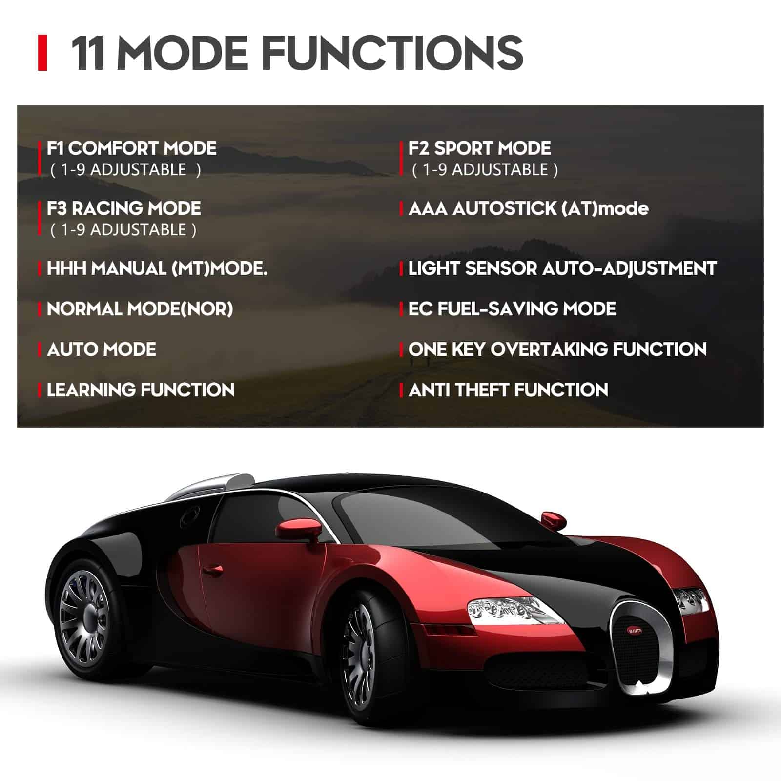 4. Más funciones – Además del modo de confort original, modo deportivo, modo de carrera, modo de ahorro de combustible EC, modo normal, modo AAA Autostick (AT), modo HHH Manual (MT), también agregamos un nuevo modo de automóvil, modo de aprendizaje, función de adelantamiento con una tecla, función antirrobo.