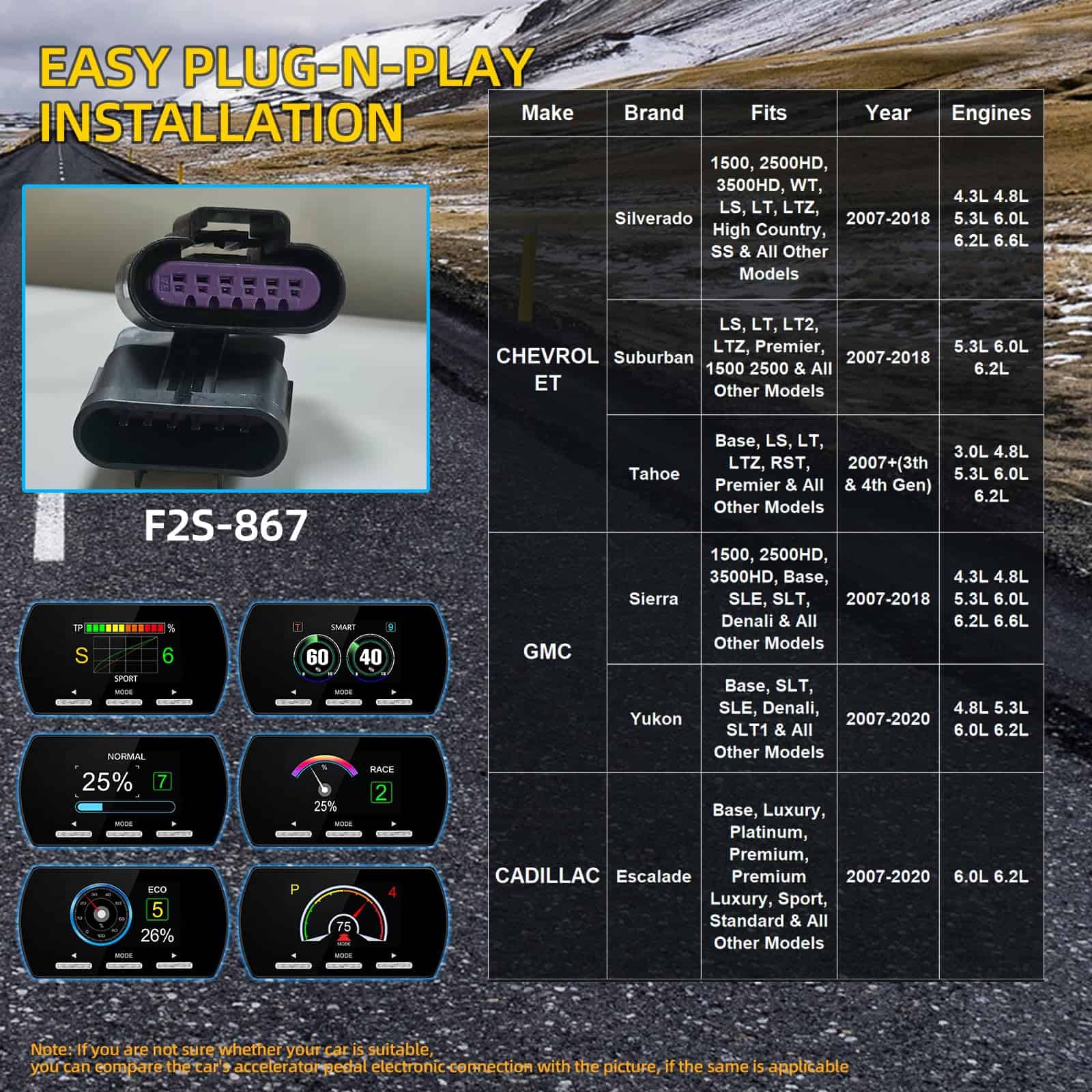 2. Modelo 867 Vehículos compatibles El Modelo 867 es compatible con GMC Sierra 1500, 2500HD, 3500HD, Base, SLE, SLT, Denali 2007-2018, Yukon Base, SLT, SLE, Denali, SLT1 2007-2020, compatible con Silverado 1500, 2500HD, 3500HD, WT, LS, LT, LTZ, High Country, SS 2007-2018, Suburban, Tahoe, compatible con Cadillac Escalade 2007-2020. .