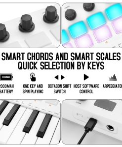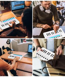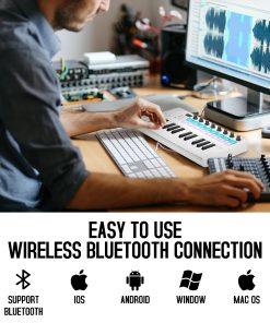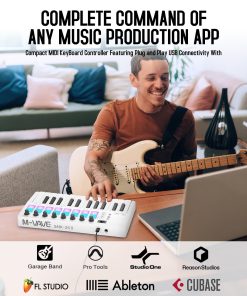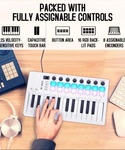 Controlador MIDI USB de 25 teclas M-WAVE con pads de batería retroiluminados RGB sensibles a la velocidad, 8 codificadores rotativos asignables, 2 tiras de contacto capacitivas para curva de tono a todos sus plugins de estudio de música para mezclar, ajustar controles de sintetizador y más. Compacto y portátil, se puede conectar de forma inalámbrica a su dispositivo con Bluetooth, la batería interna de 2,000 mAh puede funcionar durante aproximadamente 16 horas. Compatible con Windows, Mac OS, Android e iOS. Incluye una función de escala integrada para elegir rápidamente las teclas durante actuaciones y prácticas. Garantía de un año.