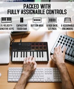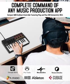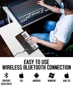 El controlador de teclado MIDI USB de 25 teclas M-Wave es muy compacto y portátil, puedes conectarlo de forma inalámbrica a tu dispositivo con Bluetooth, la batería incorporada de 2.000 mAh puede funcionar durante aproximadamente 16 horas, puedes llevar fácilmente este teclado MIDI ultraportátil en casi cualquier bolso y llevarlo contigo al estudio, cafetería u hotel para componer música. Tiene 25 teclas sensibles a la velocidad, 8 pads retroiluminados RGB sensibles a la velocidad, 8 codificadores rotativos asignables, 2 rayas táctiles capacitivas para doblar la entonación a todos tus plugins de estudio de música para mezclar, ajustar controles de sintetizadores y más. Es compatible con Windows, Mac OS, Android e iOS, compatible con todas las estaciones de trabajo de audio digital, Ableton Live, Fl Studio, Cubase, Logic Pro X, Bitwig, Reason, Studio One, GarageBand (iOS), etc. Tiene una función de escala para integrar los acordes inteligentes y la función de sonido inteligente, los usuarios pueden seleccionar rápidamente a través de las teclas. Muy adecuado para configurar esta función durante la actuación y la práctica. Garantía de un año.