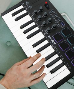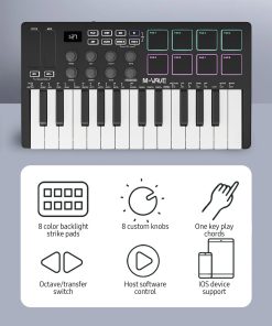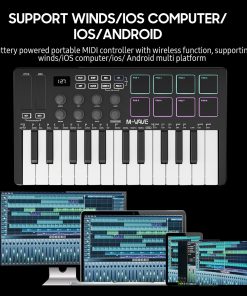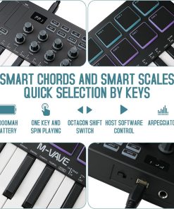 Controlador de teclado MIDI USB M-VAVE de 25 teclas con 8 pads de batería retroiluminados, teclado de piano semipesado profesional con teclado dinámico de 8 perillas, software incluido. Esencial para compositores de canciones y creadores de ritmos – Controlador MIDI alimentado por USB, con 25 teclas de mini teclado MIDI sensibles a la velocidad, para producción de sala de grabación, control de sintetizador virtual y producción de ritmos. 25 teclas sensibles a la velocidad, 8 pads retroiluminados RGB sensibles a la velocidad, 8 rotadores distribuibles, 2 barras táctiles de alta capacidad sonora para todos los plugins de estudio de música para mezclar y ajustar el control sintético. Compatible con Windows, Mac OS, Android e iOS, K5 compatible con todas las estaciones de trabajo de audio digital, Bitwig, Ableton Live, FL Studio, Logic Pro X, Reason, Cubase, Studio One, GarageBand (iOS), etc. Es muy compacto y portátil, puede conectarlo a su dispositivo de forma inalámbrica, la batería incorporada de 2000 mAh puede funcionar durante aproximadamente 16 horas, puede poner fácilmente este teclado MIDI ultraportátil en casi cualquier bolso, y llevarlo a un lugar donde se sienta cómodo, como un estudio, para crear música. Incluyendo el software de ritmo MPC: hardware basado en festival MPC MPC, con miles de samples de batería y presets de instrumentos de plug-in, se puede utilizar para una potente e inspirada producción conjunta y creación de música. Función de escala – Integre acordes inteligentes y funciones de sonido inteligente, los usuarios pueden elegir rápidamente a través de las teclas. Es muy adecuado para configurar esta función durante la actuación y la práctica. 45 días de devolución y garantía de un año.