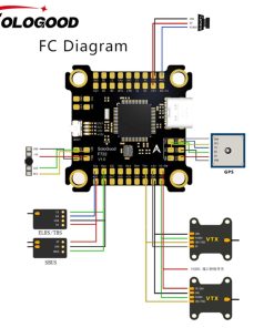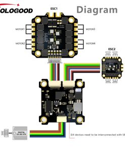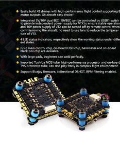 Controlador principal: STM32F722RET6, Giroscopio: ICM42688P, Barómetro: Soporte (DPS310), OSD: Soporte (AT7456E), BEC: 10V/2A, 5V/2A, Puerto UART: 6, Black box: incorporado (memoria flash de 16M), Número de motores compatibles: M1-M8, Nombre del firmware: BETAFLIGHT: SOLOGOODF722, Voltaje de entrada: batería de litio 3-6S (11-26V MÁX), Voltaje de salida: VBAT, Orificio de instalación: 30.5×30.5mm (apertura de 4 mm), Tamaño del control de vuelo: 38.5×38.5mm, Peso: 8.1 gramos, Estado del LED: azul: estado del giroscopio, verde: indicación 3V3, rojo: indicación 5Vbec, blanco: indicación 10Vbec, DJI/Vista: Soporte/6pin, Regulación eléctrica, Diodo de protección TVS: Sí, Capacitor externo: condensador de 1000uF de alta frecuencia y baja resistencia (incluido en el embalaje), Protocolo ESC/Motor: DSHOT300/600, Corriente continua: 60A, Corriente máxima: 65A, Orificio de instalación: 30.5×30.5mm (apertura de 4 mm)