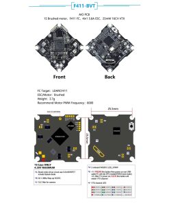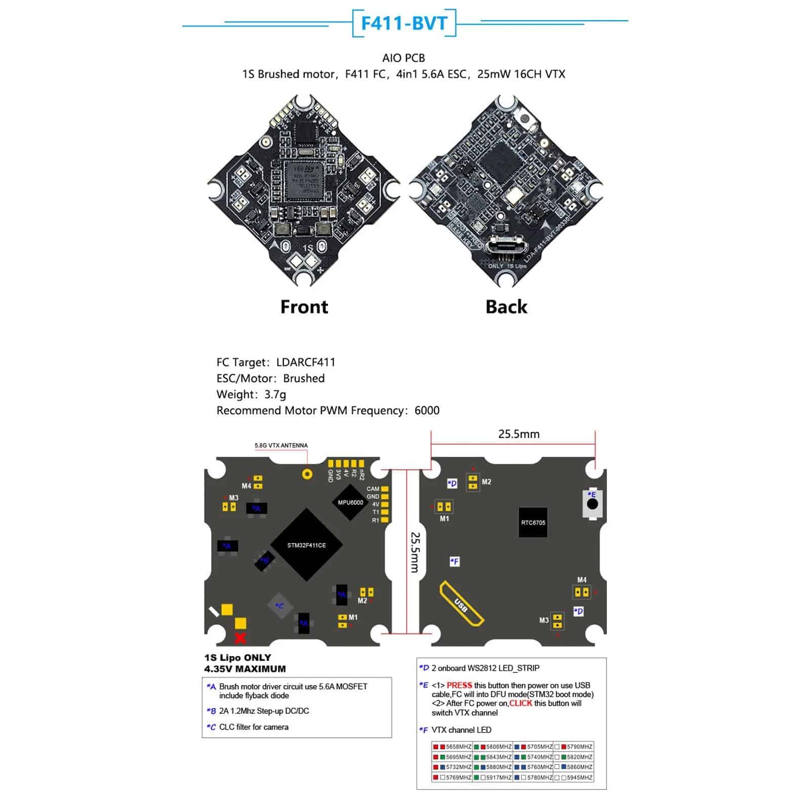 ¡Una increíble experiencia de vuelo empaquetada en un tamaño PEQUEÑO! Con solo 3.7g, este controlador de vuelo/ESC ofrece 5.6A por canal y la capacidad de un procesador F411. También incluye un micro VTX 25mW de 16CH. La placa micro es compatible con todos los motores brushed de hasta tamaño 1250 y hasta 5A por motor (corriente máxima 8A). Processor: F411 Target: LDARCF411 Input Voltage: 3.7-4.35V Mounting Dimensions: 25.5×25.5mm (M3) Weight: 3.7g Recommended motor PWM Frequency: 6000 Package Contents: 1x LDARC F411-BVT Flight Controller AIO FC ESC VTX 1x Micro Losi Power Cable 2x JST Power Cable 1x Bushing Adapters for M2 Screws