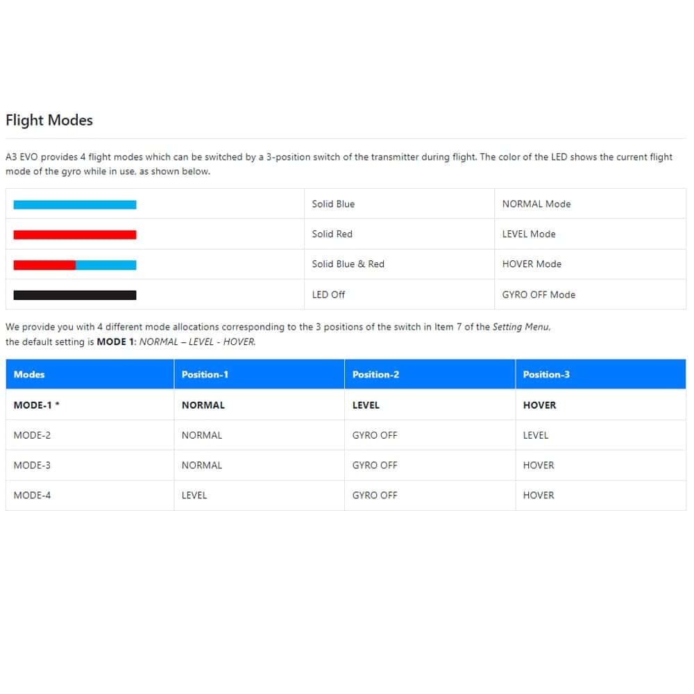 4 Modos de Vuelo: Modo GYRO OFF, Modo NORMAL, Modo LEVEL y Modo HOVER.