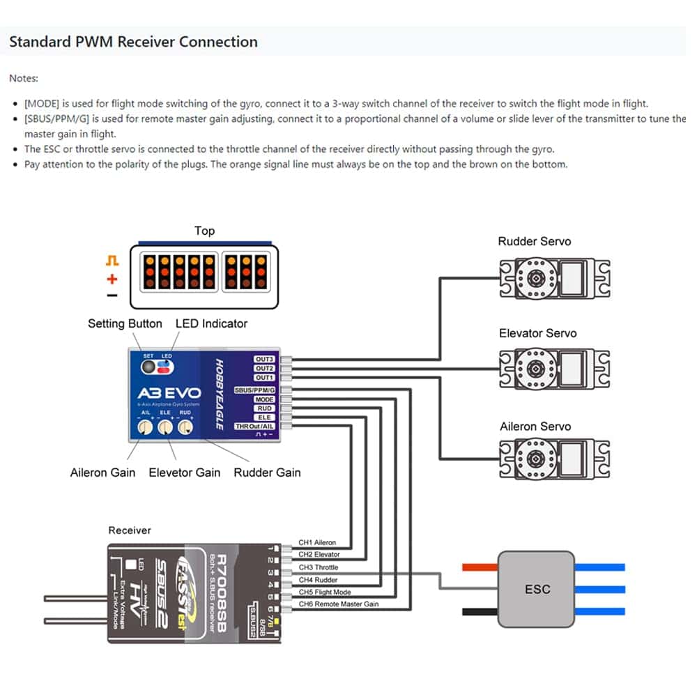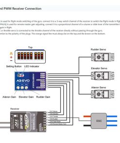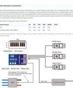 El MODE se utiliza para el cambio de modo de vuelo del giroscopio, conéctelo a un canal de interruptor de 3 vías del receptor para cambiar el modo de vuelo en vuelo. SBUS/PPM/G se utiliza para ajustar la ganancia maestra remota, conéctelo a un canal proporcional de un botón de volumen o palanca deslizante del transmisor para ajustar la ganancia maestra en vuelo.