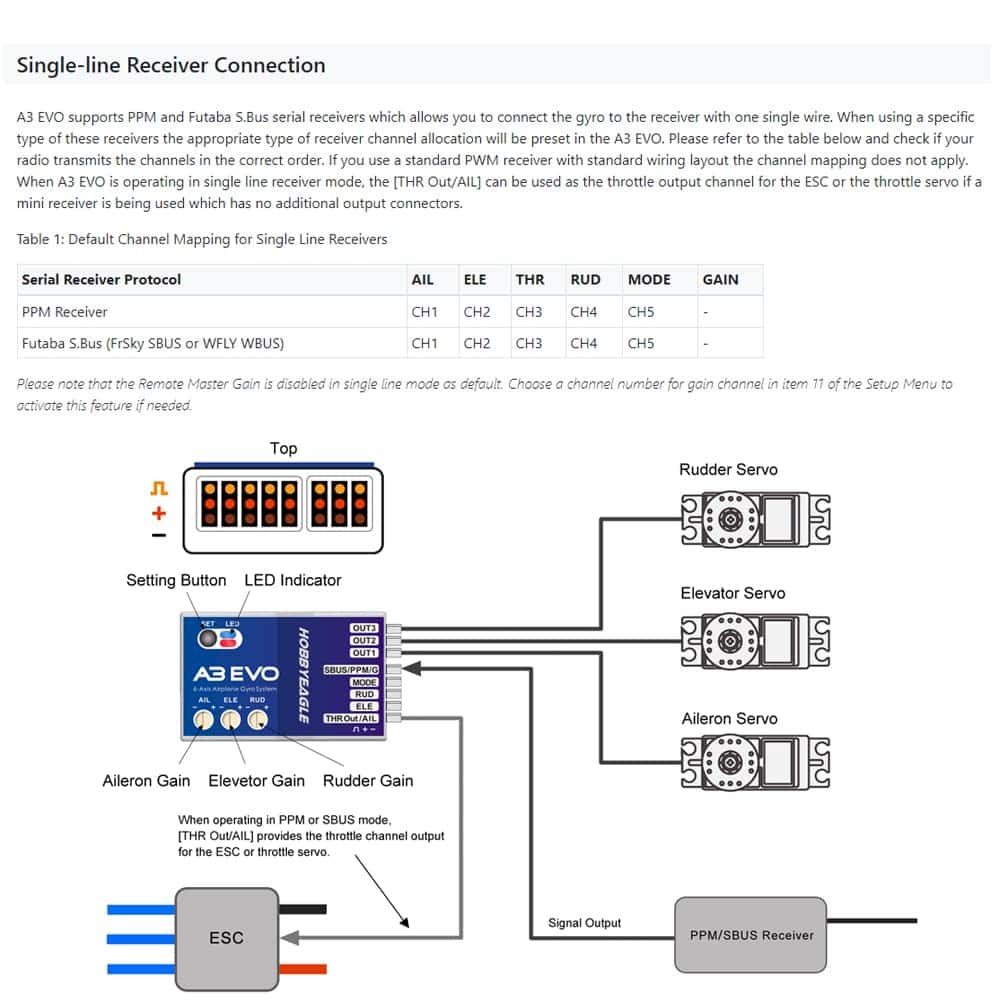 Soporta receptores PWM estándar, PPM y Futaba S.Bus. Canal de salida de acelerador proporcionado al usar el modo PPM o S.Bus.