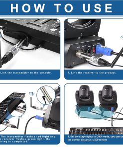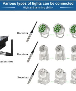 Controlador DMX512 inalámbrico de MIMIRACLE, modelo Dfi DJ 2.4G, que incluye 1 transmisor y 5 receptores para control de iluminación en escenarios. Este controlador permite la transmisión de datos de protocolo DMX512 estándar de manera inalámbrica, eliminando la necesidad de cables enredados y brindando una transmisión de datos fiable y en tiempo real sin retraso. Con un rango de comunicación de hasta 500 metros (distancia visible), este controlador es ideal para configuraciones de escenario de gran tamaño. Su diseño altamente eficiente y antijamming utiliza una modulación efectiva GFSK y saltos de frecuencia automáticos con 126 canales, garantizando una alta capacidad antijamming. Además, es configurable con 7 códigos de identificación de grupos, lo que permite el uso de 7 redes inalámbricas individuales sin interferencias en el mismo lugar. Este controlador es perfecto para aplicaciones versátiles como iluminación de escenario, discotecas, conciertos y lámparas de efecto PAR, ofreciendo la libertad de control de iluminación sin cables.
