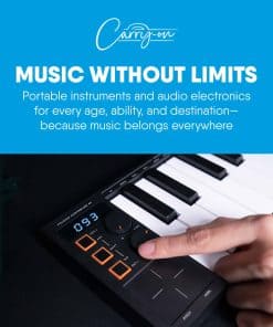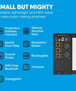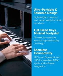 1. ¡Dobla y crea en cualquier lugar! Este controlador de teclado MIDI de 49 teclas se pliega de forma ordenada en un tamaño compacto, convirtiéndose en el compañero de viaje perfecto para músicos y productores. Pesa menos de dos libras, cabe fácilmente en una mochila o equipaje de mano. 2. Unifica tu mundo musical: Conéctate fácilmente a tus dispositivos a través de USB, Bluetooth o la salida MIDI TRS de 3,5 mm. Nuestro controlador de teclado MIDI es totalmente compatible con Mac, PC, iOS, garantizando una integración perfecta con tu estación de trabajo de audio digital. 3. 8 horas de creatividad ininterrumpida: Nuestro controlador MIDI Bluetooth tiene una batería recargable USB incorporada que dura hasta 8 horas. Esto es adecuado para actuaciones y sesiones de práctica en movimiento sin la molestia de fuentes de alimentación externas. 4. Energía única del touchpad: Mejora tu experiencia musical con un touchpad X/Y integrado para modulación expresiva y control de tono, dos botones completamente personalizables para ajustes de parámetros sobre la marcha y controles de transporte dedicados. 5. Suite de software completa: Mejora tu viaje de creación musical con una descarga gratuita de software a través de nuestra asociación con Cubase y Cubasis LE. También disfruta de acceso a 40 lecciones gratuitas de Melodics y un curso de teclas de bonificación para mejorar tus habilidades.