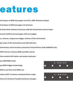 Controlador Multi Inteligente XSONIC Airstep Combo que te permite enviar diversos mensajes MIDI a través de diferentes tipos de conexiones como 5-Pin, USB, y Bluetooth, así como también mensajes HID a través de Bluetooth. Con la posibilidad de enviar acciones de relé a amplificadores a través del control de pedal. Además, te permite enviar hasta 8 mensajes diferentes con tan solo una presión. Incluye 5 pedales y 5 pedales de extensión inalámbricos para una mayor versatilidad y comodidad en tu experiencia musical.
