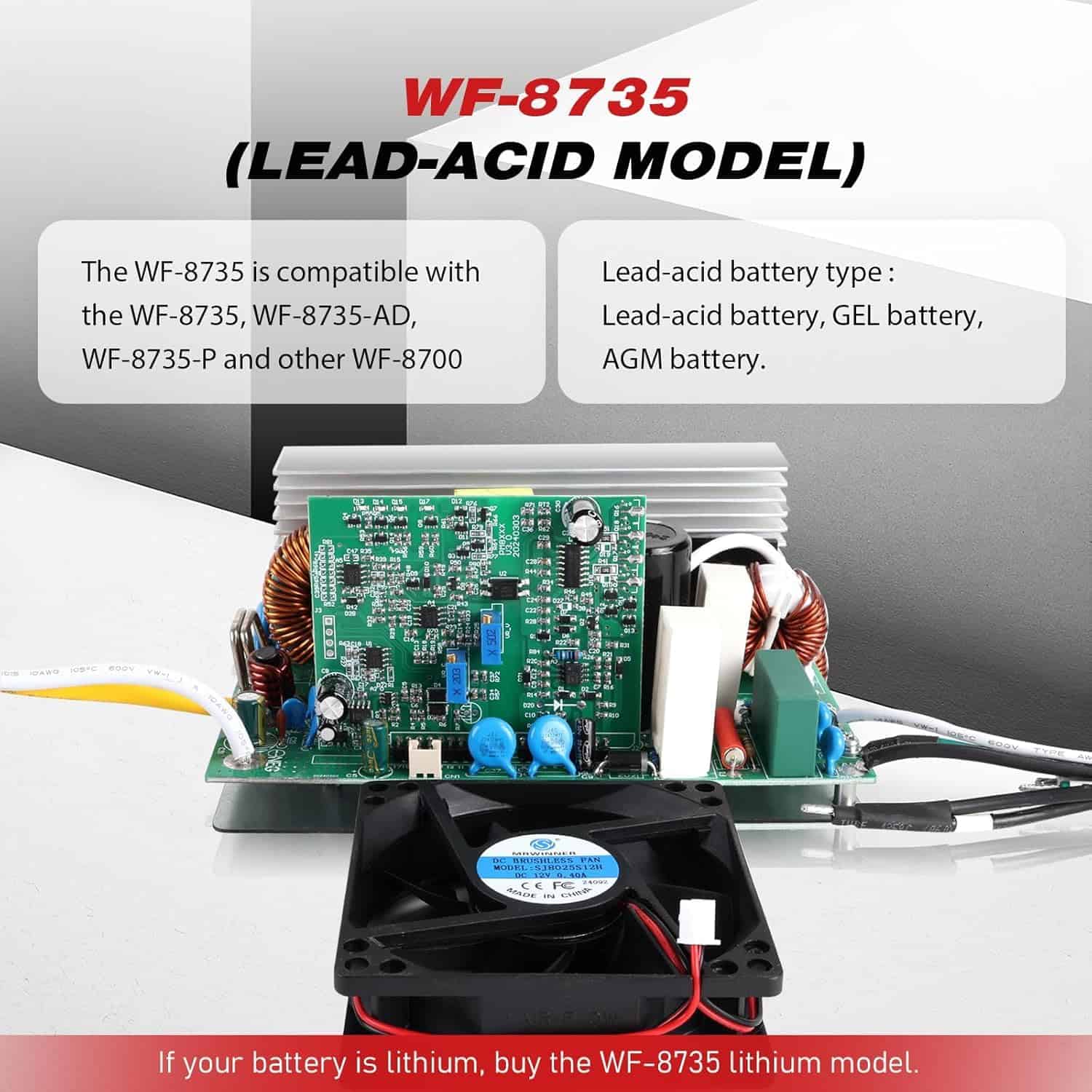 1. DISEÑADO PARA BATERÍAS DE ÁCIDO-PLOMO: Este conversor WF-8735 es perfectamente compatible con WF-8735, WF-8735-AD, WF-8735-P y otros conversores de la serie WF-8700, y está específicamente diseñado para baterías de ácido-plomo de 12 voltios.