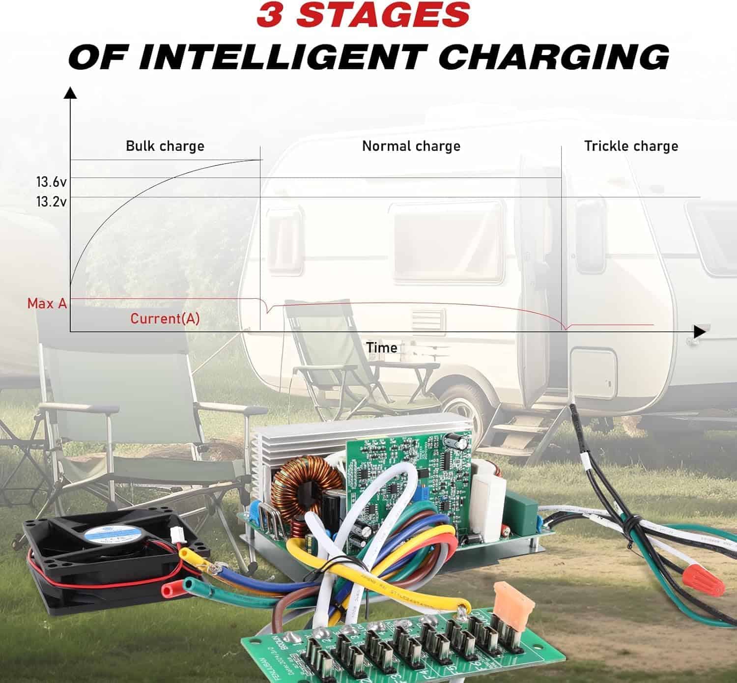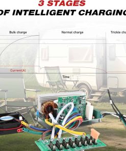 3. CARGA DE TRES ETAPAS: Este conversor de energía para RV adopta una carga de tres etapas. El conversor aumentará el voltaje de tu batería a 14.6 voltios y luego entrará en modo de goteo. En este modo, el conversor mantiene el nivel de la batería en todo momento.