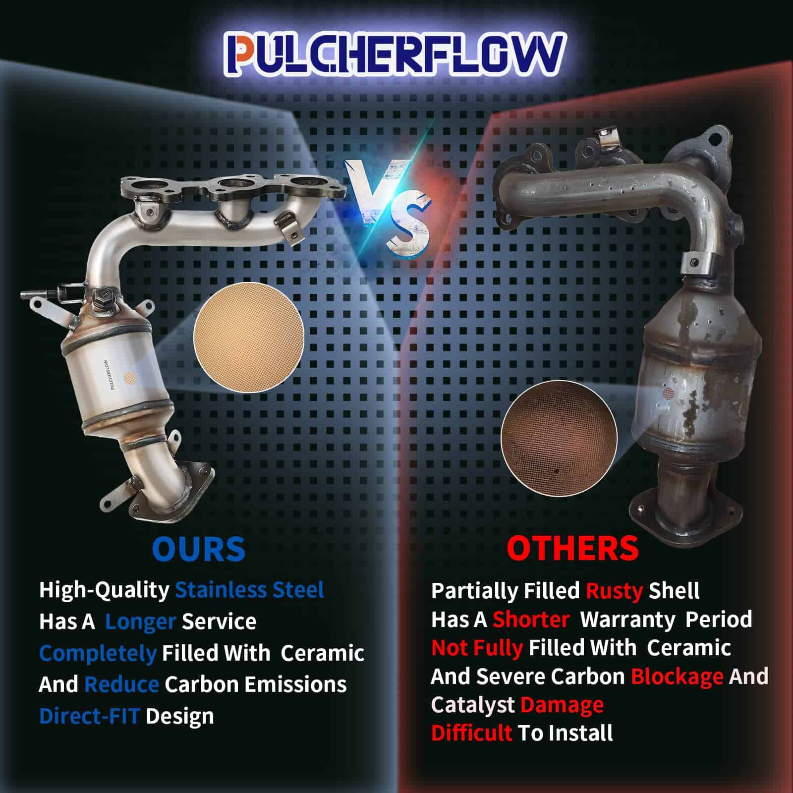 Convertidor catalítico de alto rendimiento PulcherFlow Mejor flujo, mejor rendimiento (Cumple con la normativa EPA). El material de sustrato premium y un revestimiento de lavado de alta tecnología garantizan una capacidad excepcional de almacenamiento de oxígeno, mientras que la experiencia de OE proporciona piezas diseñadas específicamente para aplicaciones, Hecho de material de acero inoxidable de alta calidad, resistente, duradero, resistente a altas temperaturas y durabilidad de material catalítico duradero.