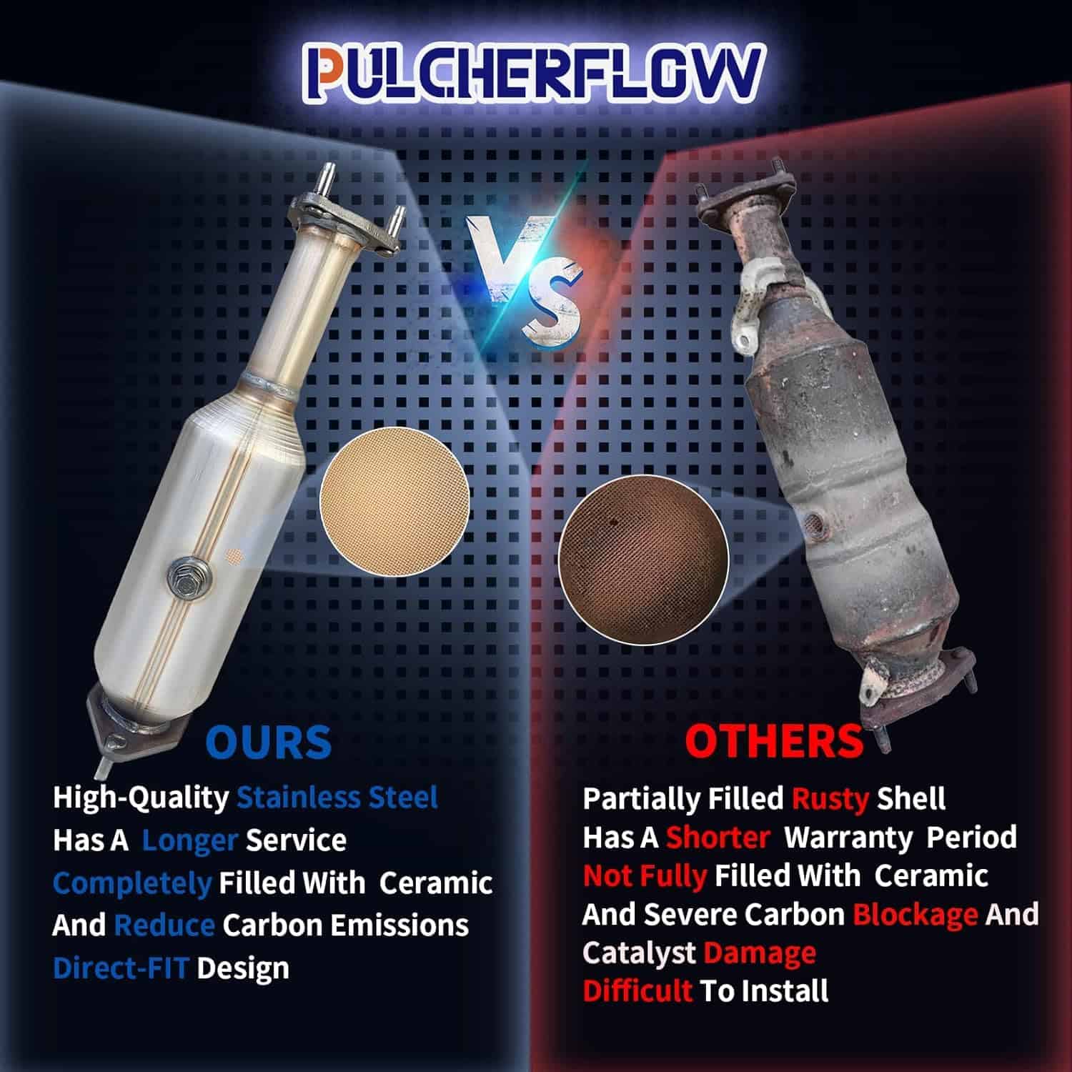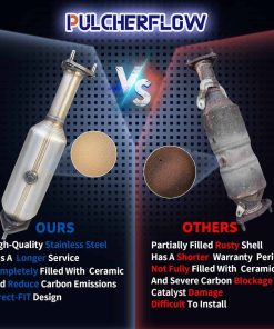 Descripción PULCHERFLOW Convertidor Catalítico de Alto Rendimiento Mejor Flujo, Mejor Rendimiento (Cumple con EPA). Material de sustrato premium y un recubrimiento de alta tecnología aseguran una capacidad excepcional de almacenamiento de oxígeno mientras que la experiencia del OEM ofrece piezas diseñadas específicamente, Hecho de material de acero inoxidable de alta calidad, resistente, duradero, resistente a altas temperaturas y material de catalizador duradero.