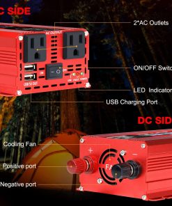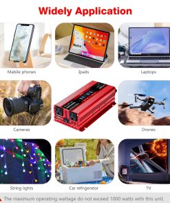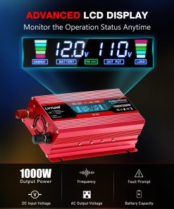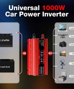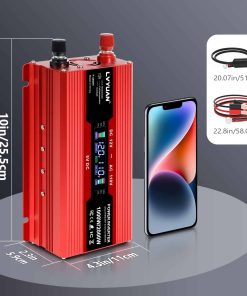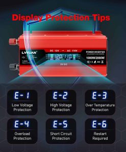 Convertidor de corriente para carro LVYUAN 1000W 12V a 110V / 120V DC a AC con 2 Tomas de corriente, Encendedor de cigarrillos, Pantalla LCD, Puertos USB para Carro, Hogar, Exterior, Camping. Convierte 12V DC a 110V AC 60Hz, proporcionando 1000 vatios de potencia continua de onda sinusoidal modificada y una salida máxima de 2000 vatios. Cuenta con 2 adaptadores de toma de corriente para carro y 2 puertos USB, haciendo que sea una excelente opción para accesorios de carro esenciales. Cuando el convertidor de corriente para carro está funcionando normalmente, la pantalla LCD mostrará el voltaje de entrada/salida, la capacidad de la batería, la capacidad de carga y la frecuencia de salida. Cuando el convertidor está en estado anormal, la pantalla LCD mostrará el código de anomalía. Por ejemplo, E-1: Protección por baja tensión, E-2: Protección por alta tensión, E-3: Protección por sobrecalentamiento, E-4: Protección por sobrecarga, E-5: Protección por cortocircuito, E-6: Apagado por falla repetida, necesita reiniciar. Los puertos USB duales pueden cargar la mayoría de los teléfonos y tabletas simultáneamente, mientras que las tomas de corriente alterna son ideales para laptop, computadora, regalos de Navidad, artículos para bebés, sacaleches, máquina CPAP, nebulizador, consola de juegos, kindle, TV, reproductores de DVD y otros dispositivos electrónicos. Incluye 2 pinzas de batería y un enchufe de encendedor de cigarrillos de 24 pulgadas para una versatilidad de compatibilidad con vehículos. Adaptador para carro con fusibles integrados, diseño de carga estable que proporciona protección contra sobretensión, subtensión, sobrecarga, sobrecalentamiento, cortocircuito y polaridad inversa. El convertidor cuenta con un ventilador de enfriamiento controlado por temperatura que comienza a funcionar inmediatamente cuando la temperatura alcanza los 113F (45 C). El cuerpo de aluminio duradero proporciona una protección superior, un enfriamiento más fácil y resistencia a entornos hostiles. Conectar y listo, ahorra tu tiempo y dinero! El paquete incluye el convertidor y todos los accesorios necesarios. Ideal para cortes de energía, emergencias, vacaciones, carros, RVs, camiones, solares, hogares, lugares de trabajo remotos o en cualquier lugar donde se necesite energía de CA. Aceptamos devoluciones e intercambios y consultas las 24 horas. Proporcionamos un servicio profesional individualizado, no dude en contactarnos si tiene alguna pregunta.