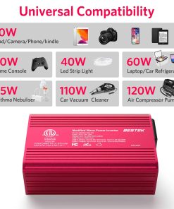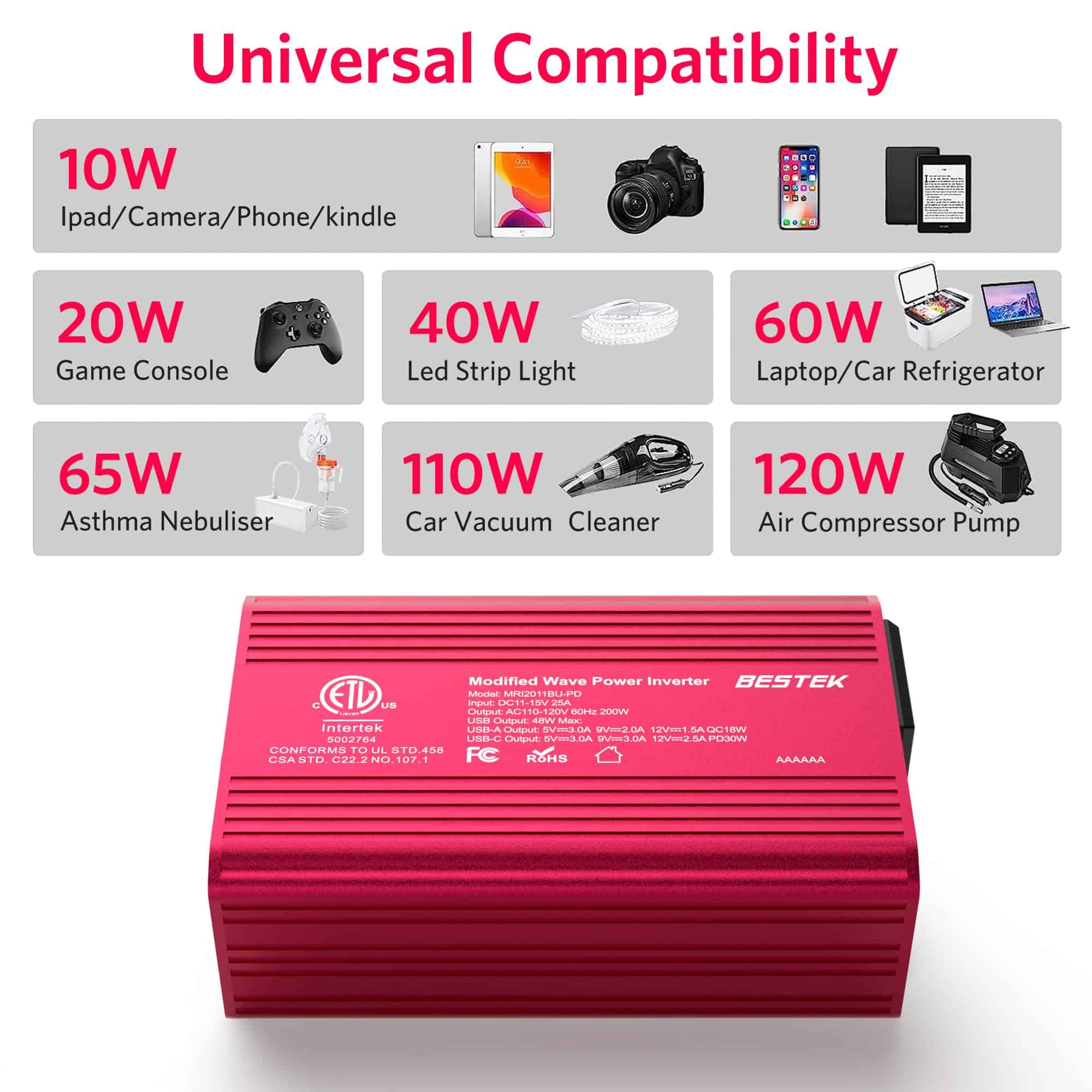 1. BESTEK Advantage: La marca líder en convertidores de corriente en América. Proporciona un convertidor de corriente de onda modificada de 200 vatios continuos de DC 12v a AC 110v con puertos USB PD 20W y QC 18W, 1 toma de corriente alterna y un cable de 24 pulgadas con enchufe para encendedor de cigarrillos.