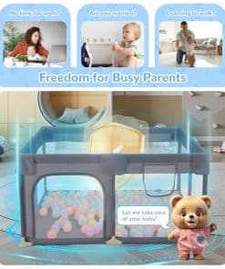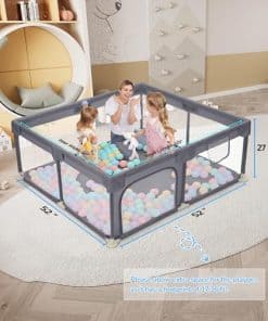 4. CENTRO DE ACTIVIDADES DIVERTIDAS PARA BEBÉS El corralito de 17.36 pies cuadrados para bebés de 6 a 12 meses le brinda a su bebé mucho espacio para practicar gatear, ponerse de pie, caminar, correr y otros movimientos. Nuestro corralito viene con 2 anillos de colores brillantes que no solo ayudan a su bebé a desarrollar fuerza en los brazos, sino que también les ayudan a divertirse más mientras aprenden a ponerse de pie. NOTA: No hay pelotas de océano en los corralitos para bebés y niños pequeños, pero hay 2 anillos colgantes.