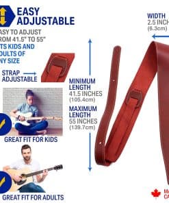1. Estilo elegante: Puedes lucir tu estilo único con las correas para guitarra de Perri’s Leathers, hechas de exquisito cuero bronceado sudamericano, con un diseño destacado de la serie de cuero de béisbol. 2. Flexibilidad de tamaño: Con nuestra correa, puedes personalizar el ajuste de tu guitarra. Con un rango de 41″ a 56″, la ajustabilidad de tamaño garantiza el ajuste ideal para la estructura de cada guitarrista. 3. Comodidad suprema: El cuero ultra suave y antideslizante de nuestra correa y el ancho óptimo de 2.5 pulgadas brindan una comodidad excepcional en los hombros, permitiéndote tocar tus instrumentos durante horas sin molestias. 4. Diseñada para perdurar: Diseñada para durabilidad, nuestra correa de cuero soporta las exigencias del uso diario, siendo un compañero confiable para todos tus conciertos y sesiones de práctica. 5. El regalo definitivo: Puedes deleitar al guitarrista de tu vida con un accesorio pensativo y elegante que combina funcionalidad con estilo, ya sea en cumpleaños, Navidad o el Día de San Valentín.