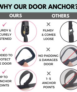 6. ACOLCHADO GRUESO PARA PROTEGER TU PUERTA: Muchas otras marcas no ofrecen acolchado, lo que puede dañar severamente tu puerta. Ofrecemos acolchado en la parte superior e inferior de la puerta, y detrás de la correa del trinquete para protegerlo.