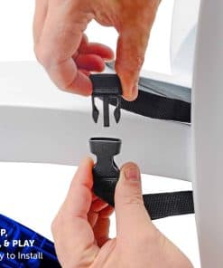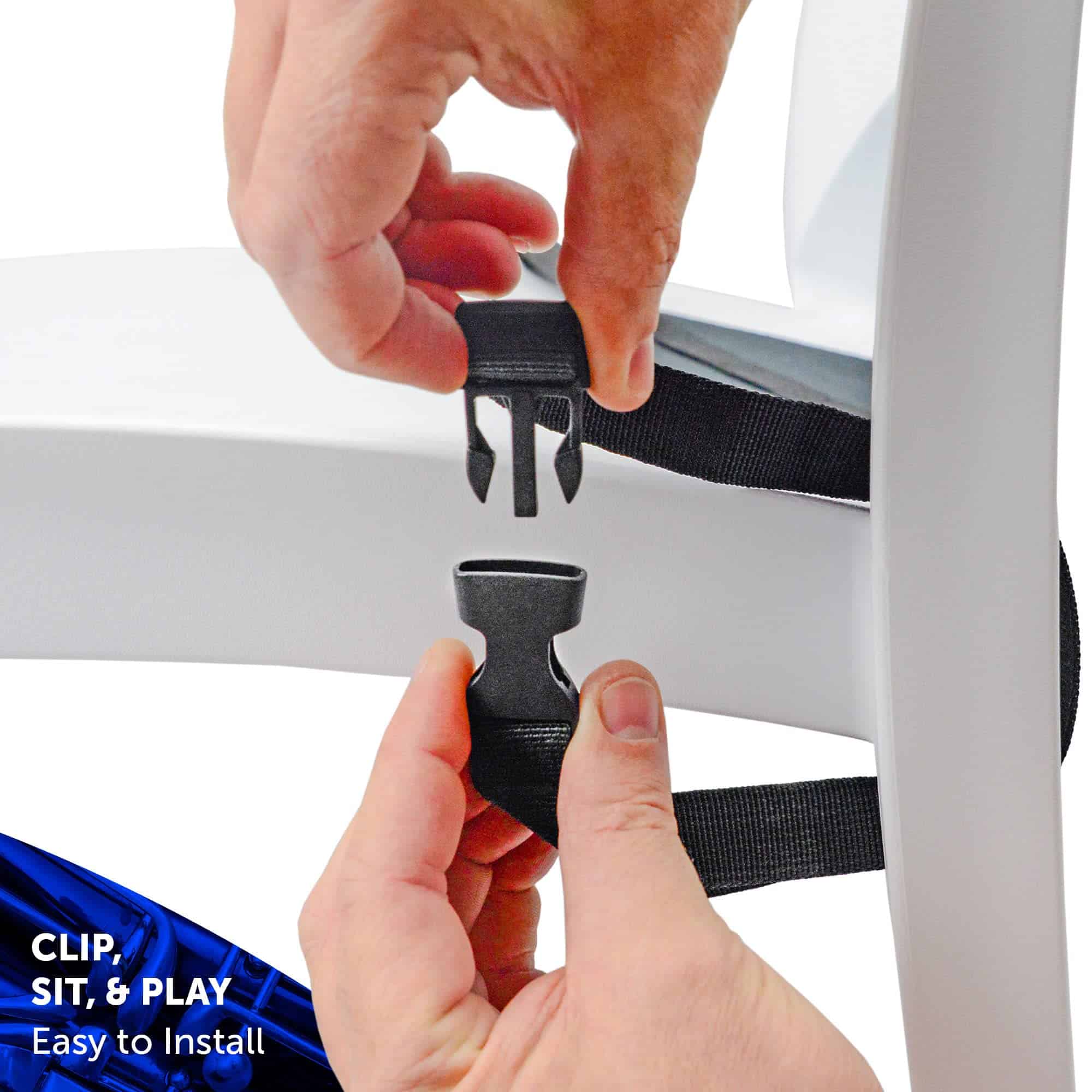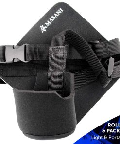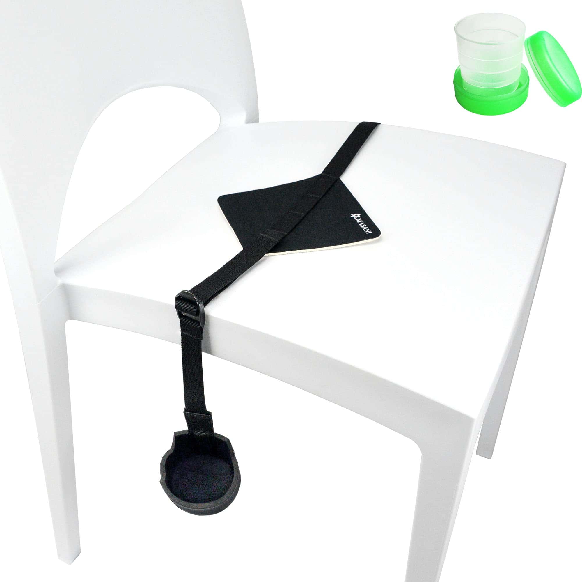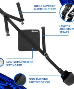 2. Fácil y rápido de configurar. Coloque la almohadilla de práctica de neopreno antideslizante con correa en una silla y asegure la correa ajustable a la pata de la silla. Personalice la altura de la copa de soporte con la correa ajustable.