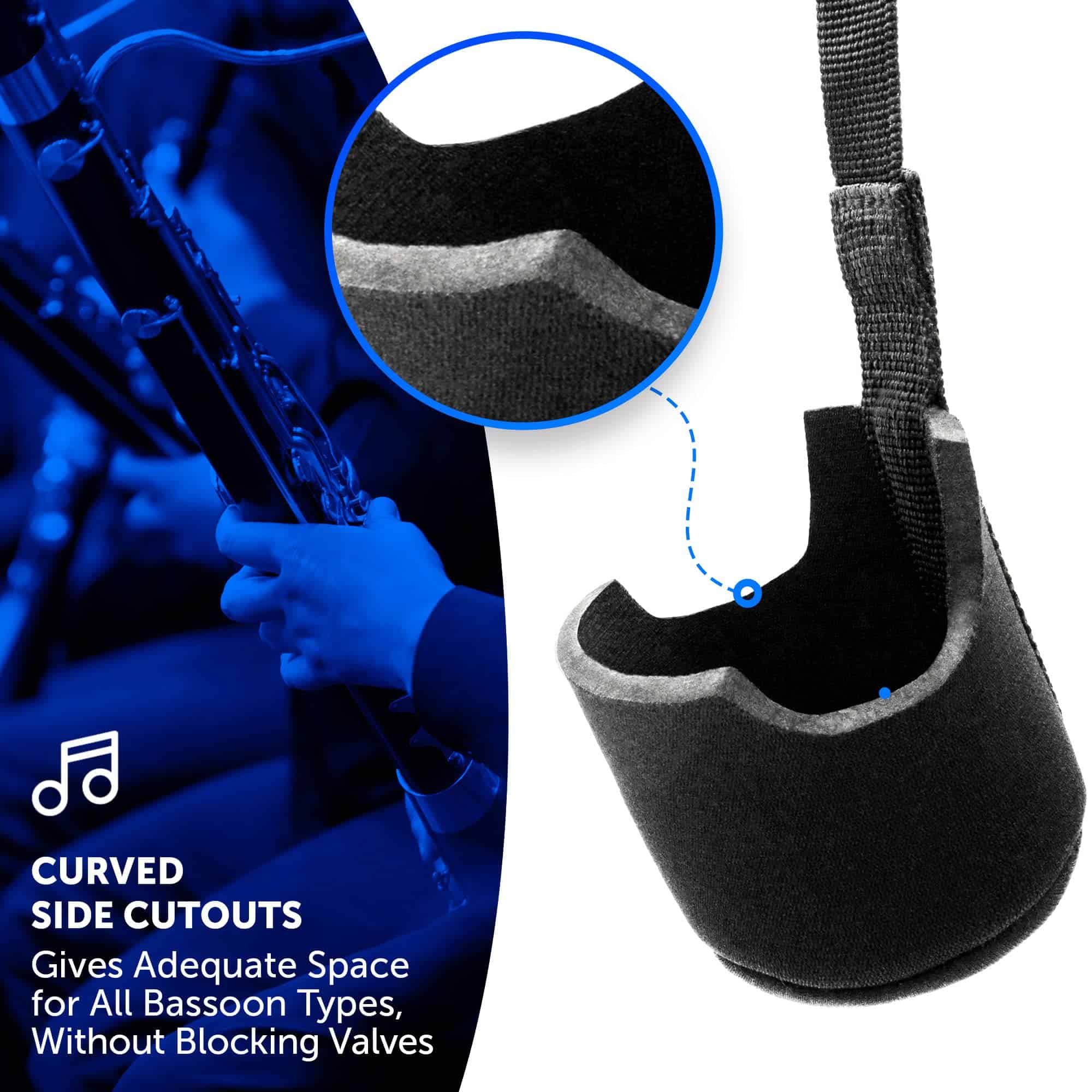 1. La correa de asiento para fagot proporciona la estabilidad y comodidad necesarias para cualquier fagotista, sin restringir el libre rango de movimiento como una correa de cuello. La copa de soporte acolchada suavemente sostiene el fagot.