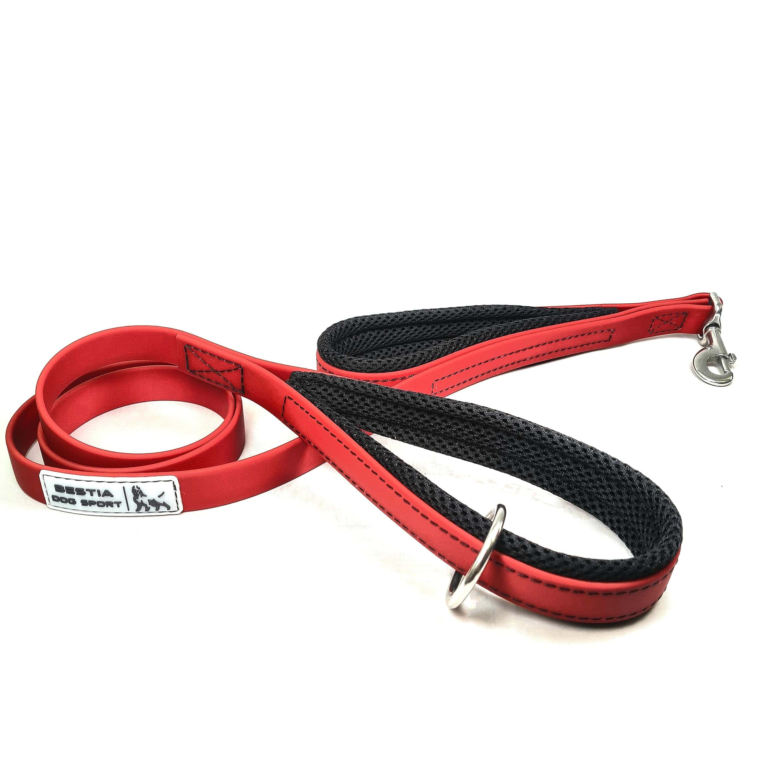 BESTIA DOG SPORT presenta: CORREA DE DOBLE MANGO BESTIA DOG SPORT. Tiene 1 pulgada (2.5 cm) de ancho y 5 pies (1.5 m) de largo. Esta correa de doble mango ultra resistente cuenta con 2 mangos acolchados y 1 mosquetón de acero inoxidable + anillo adicional. Aquí está la versión en rojo. – impermeable – ultra resistente – cómoda