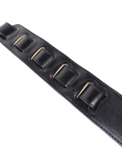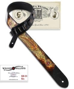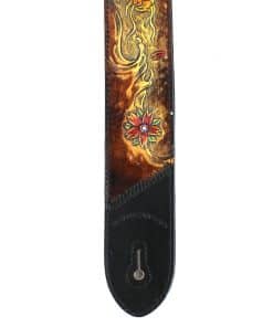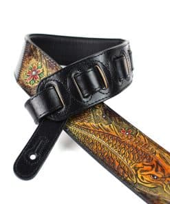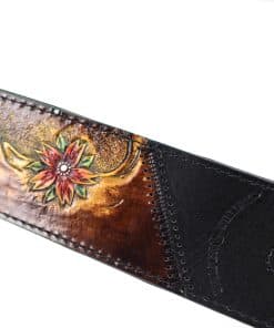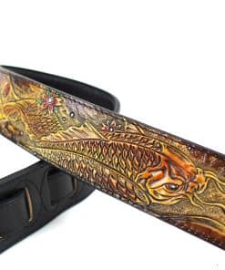 1. Cuero premium negro de semi brillo. 2. Espalda de cuero acolchado súper cómodo. 3. Diseño tallado de pez koI dorado anaranjado sobre fondo marrón Umber. 4. Ancho de 2″. 5. Ajustable de 42″ a 53″.
