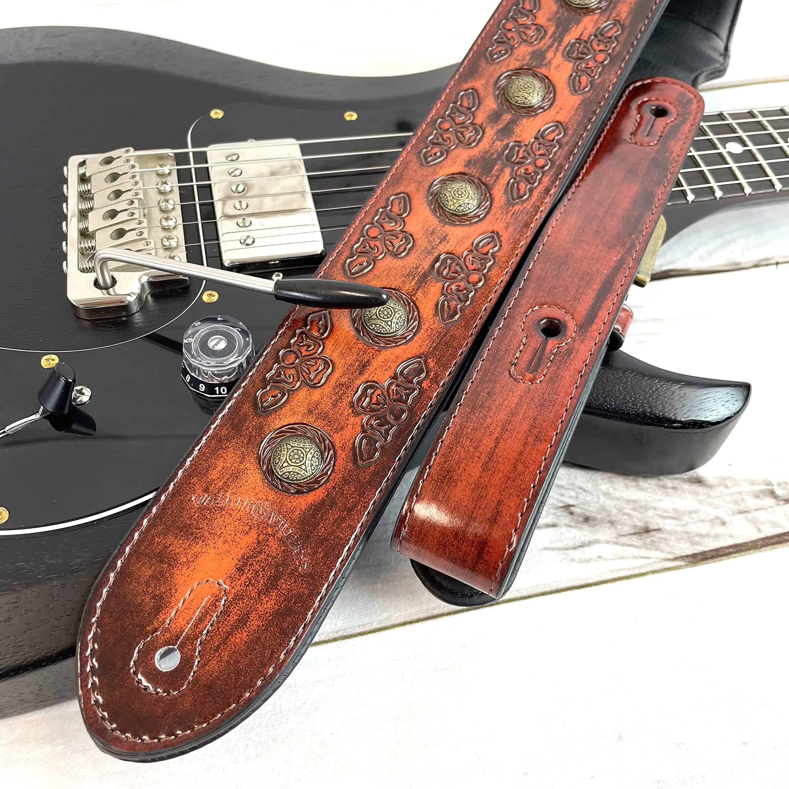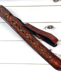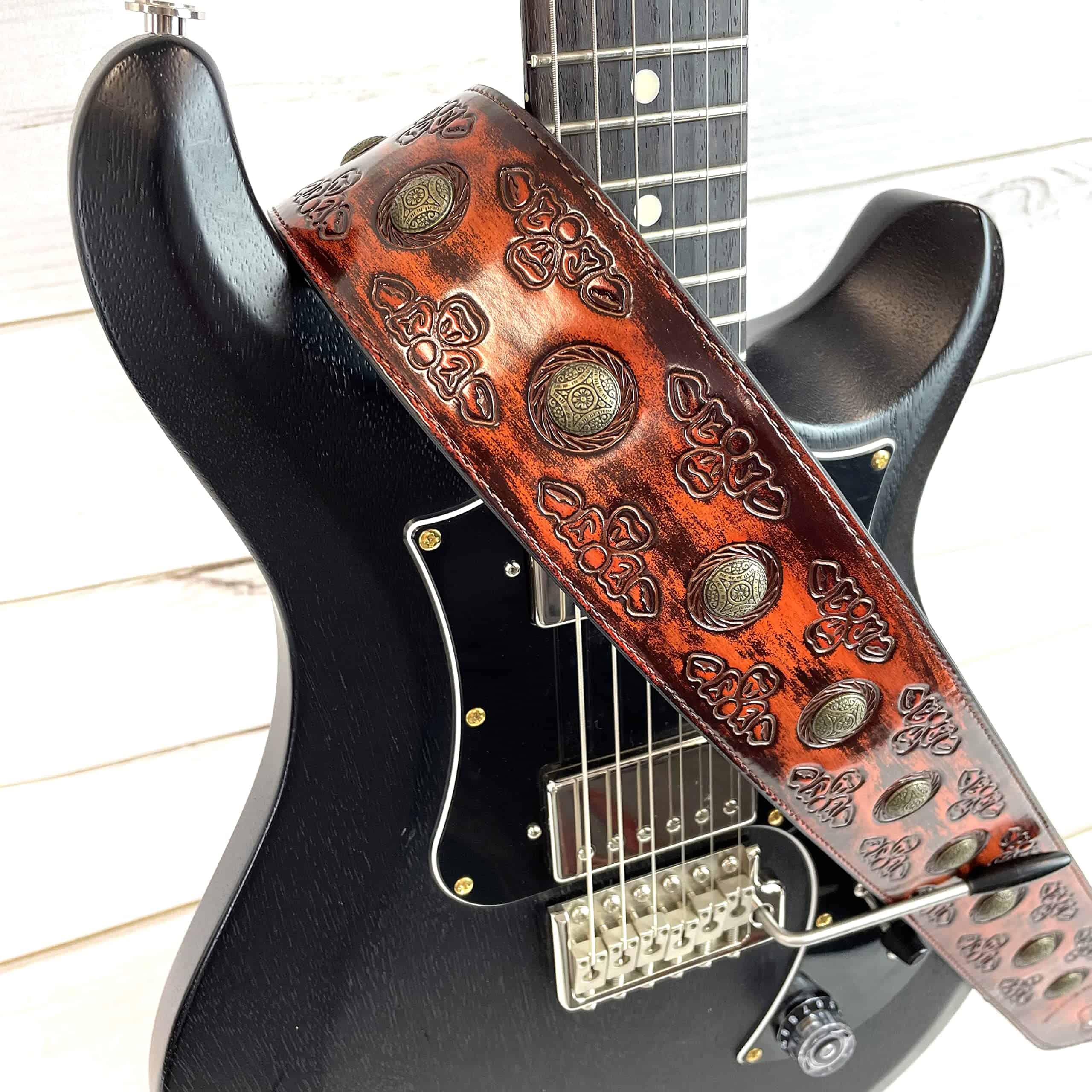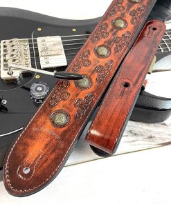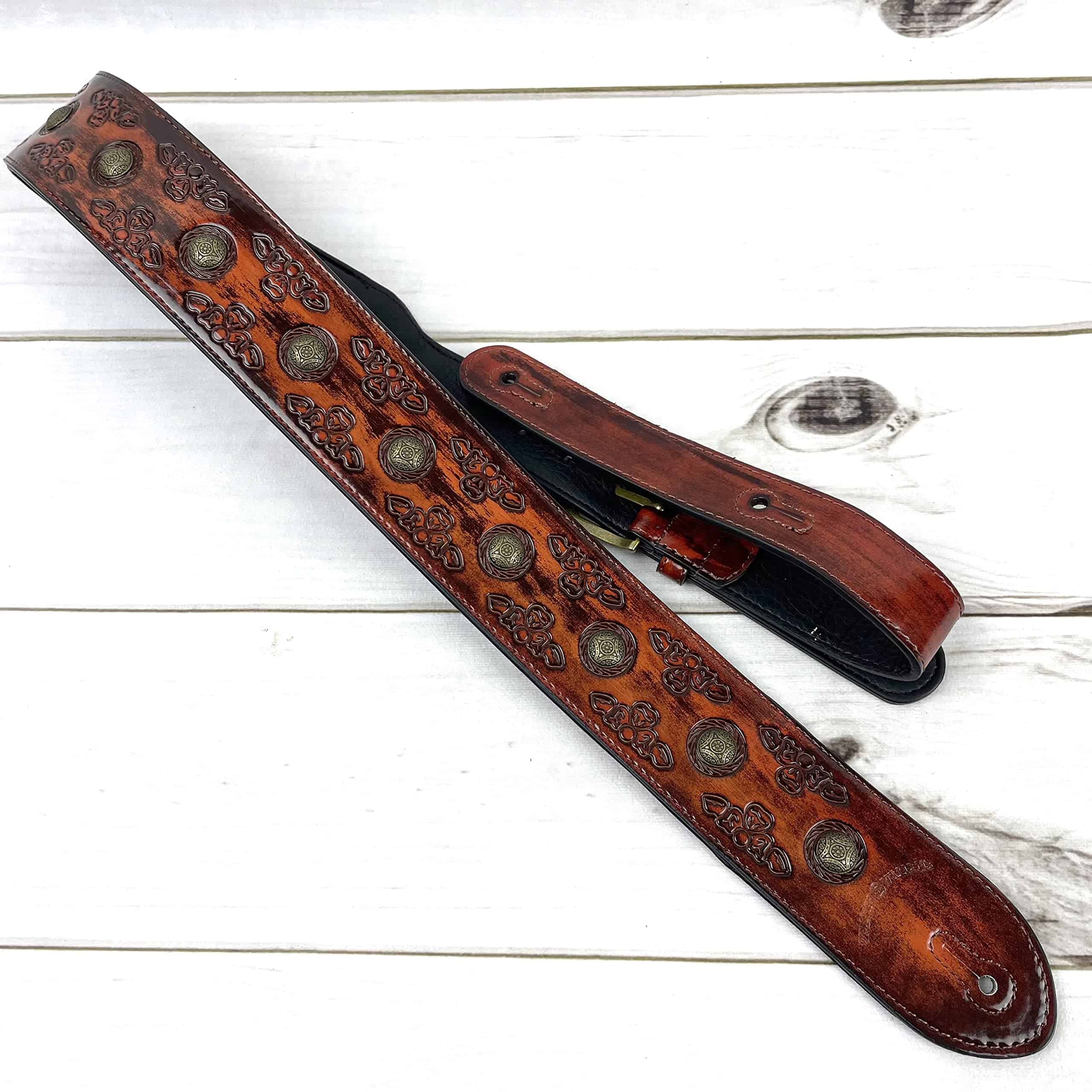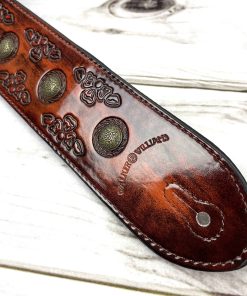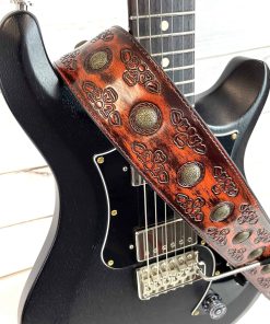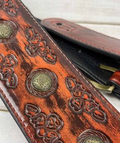 1. Correa de guitarra estilo celta color cerezo antiguo con remaches de moneda de latón envejecido.