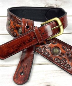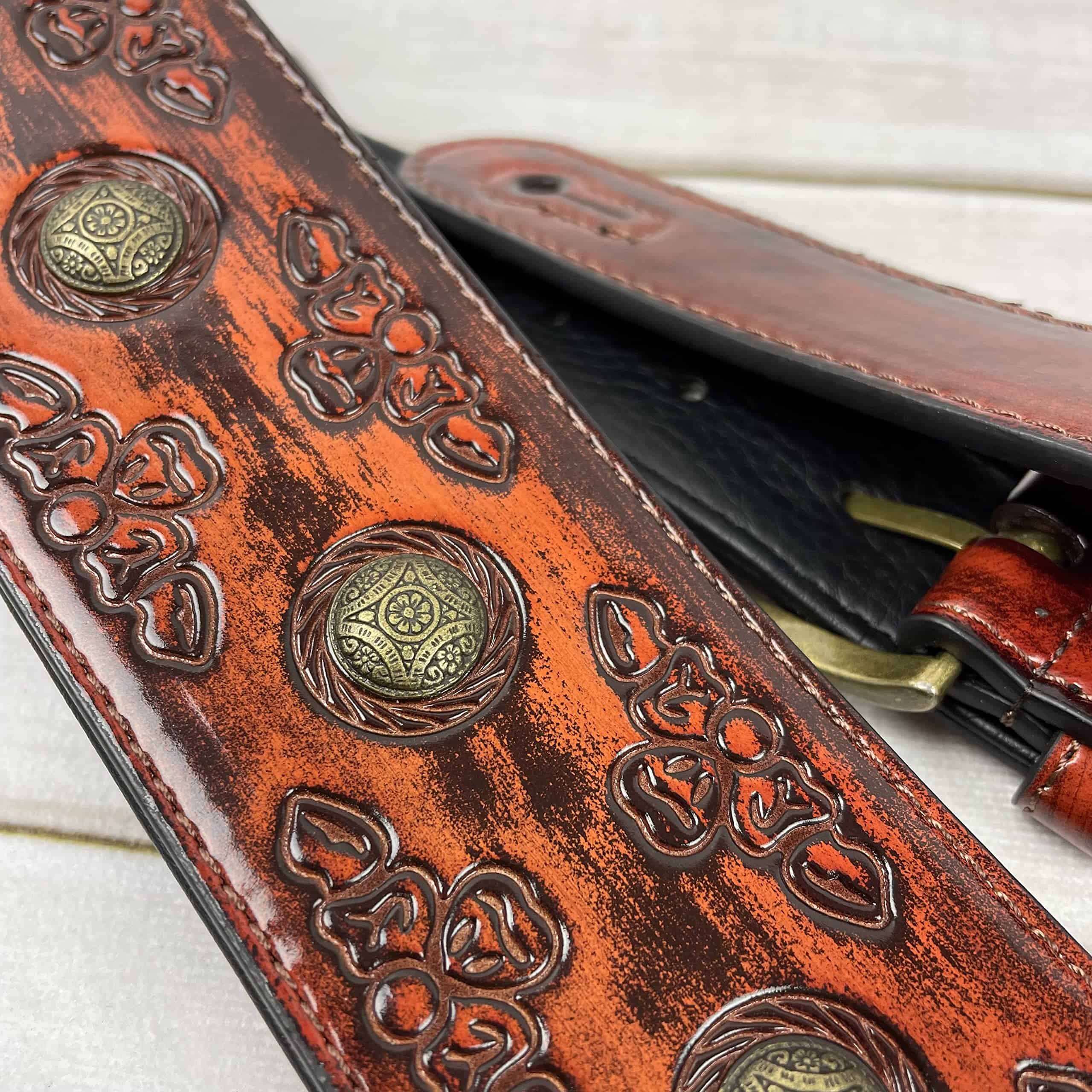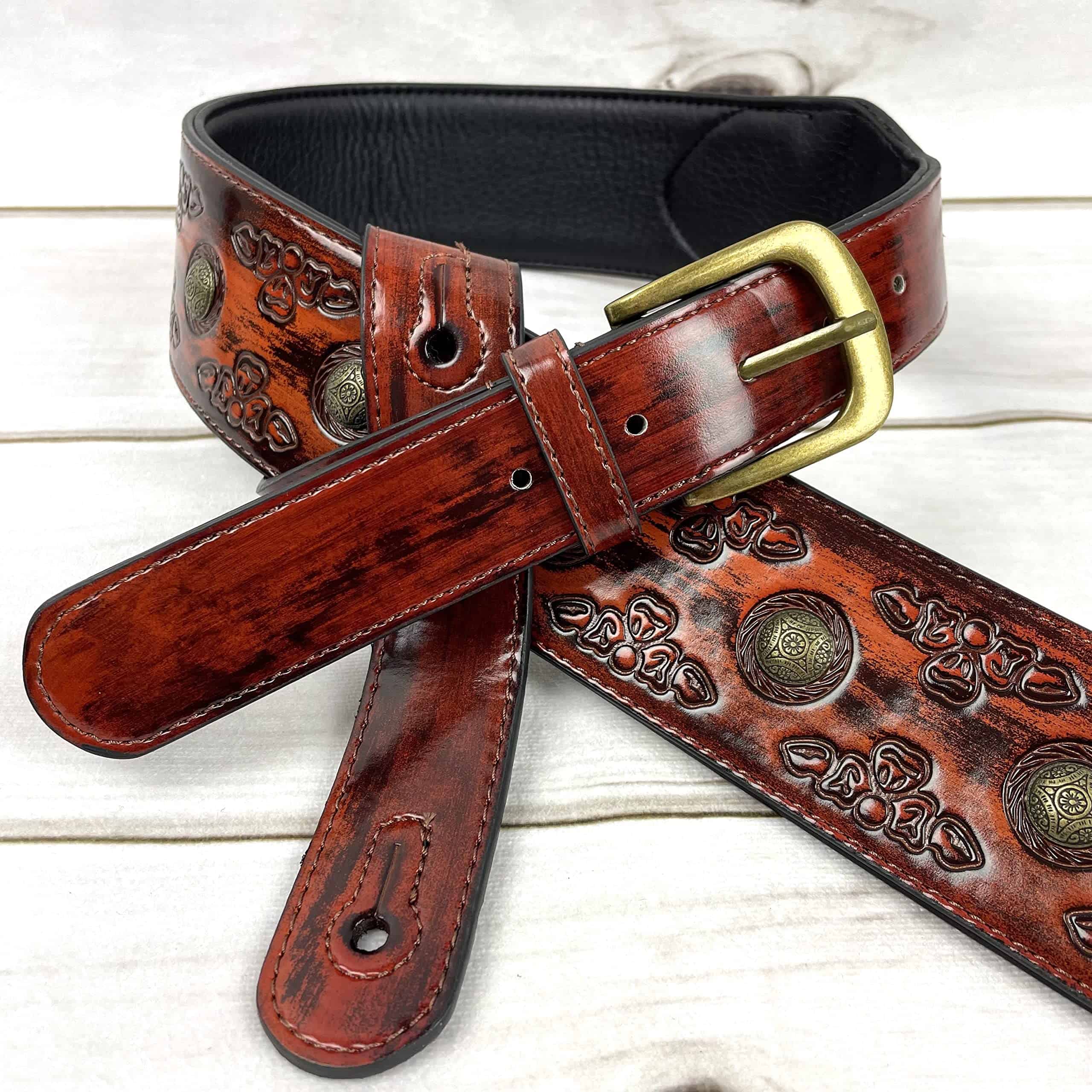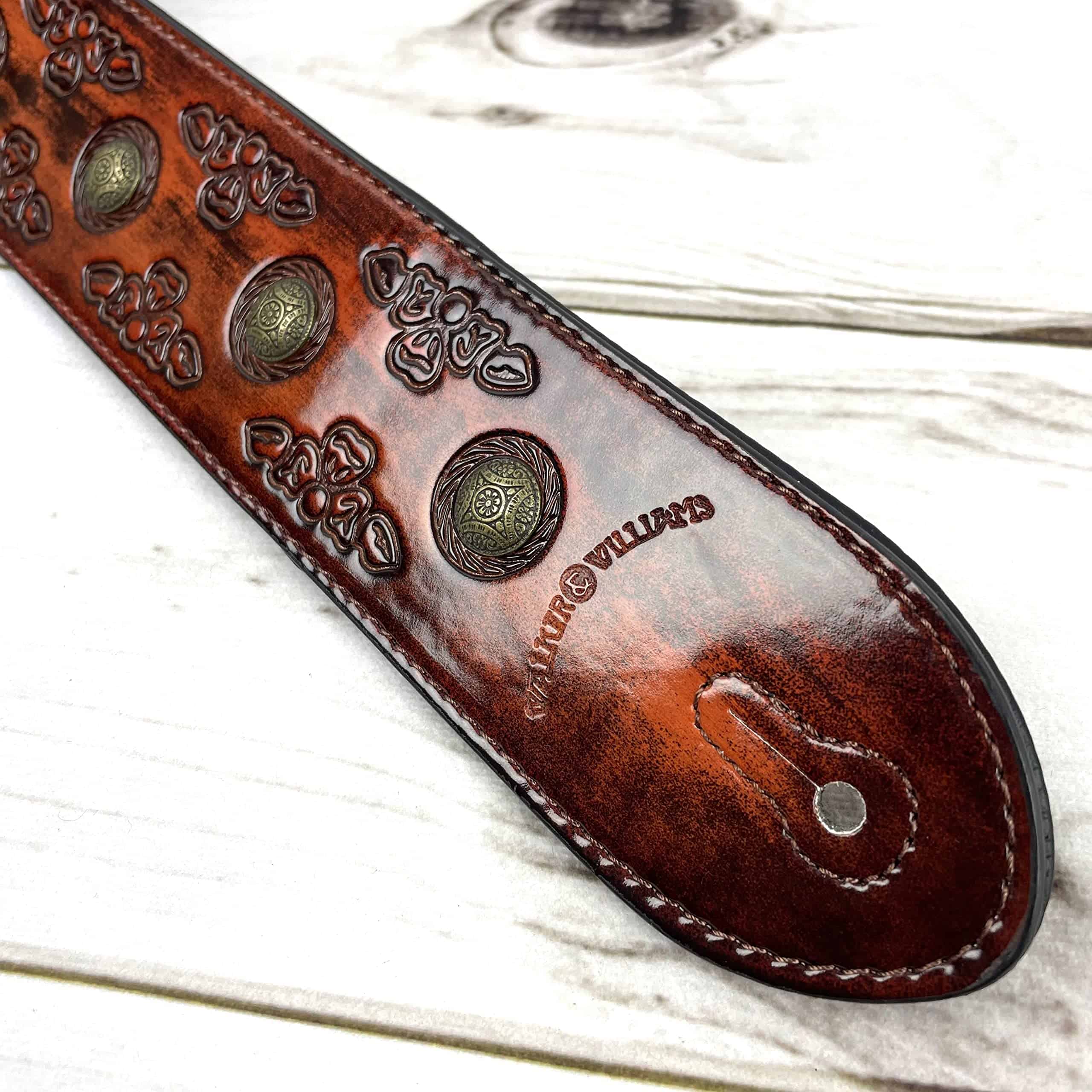 1. Correa de guitarra estilo celta color cerezo antiguo con remaches de moneda de latón envejecido.