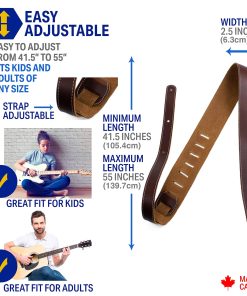 3. Comodidad Suprema: El cuero ultra suave y antideslizante de nuestra correa y el ancho óptimo de 2.5 pulgadas brindan una comodidad inigualable en el hombro, permitiéndote tocar tus instrumentos durante horas sin molestias.