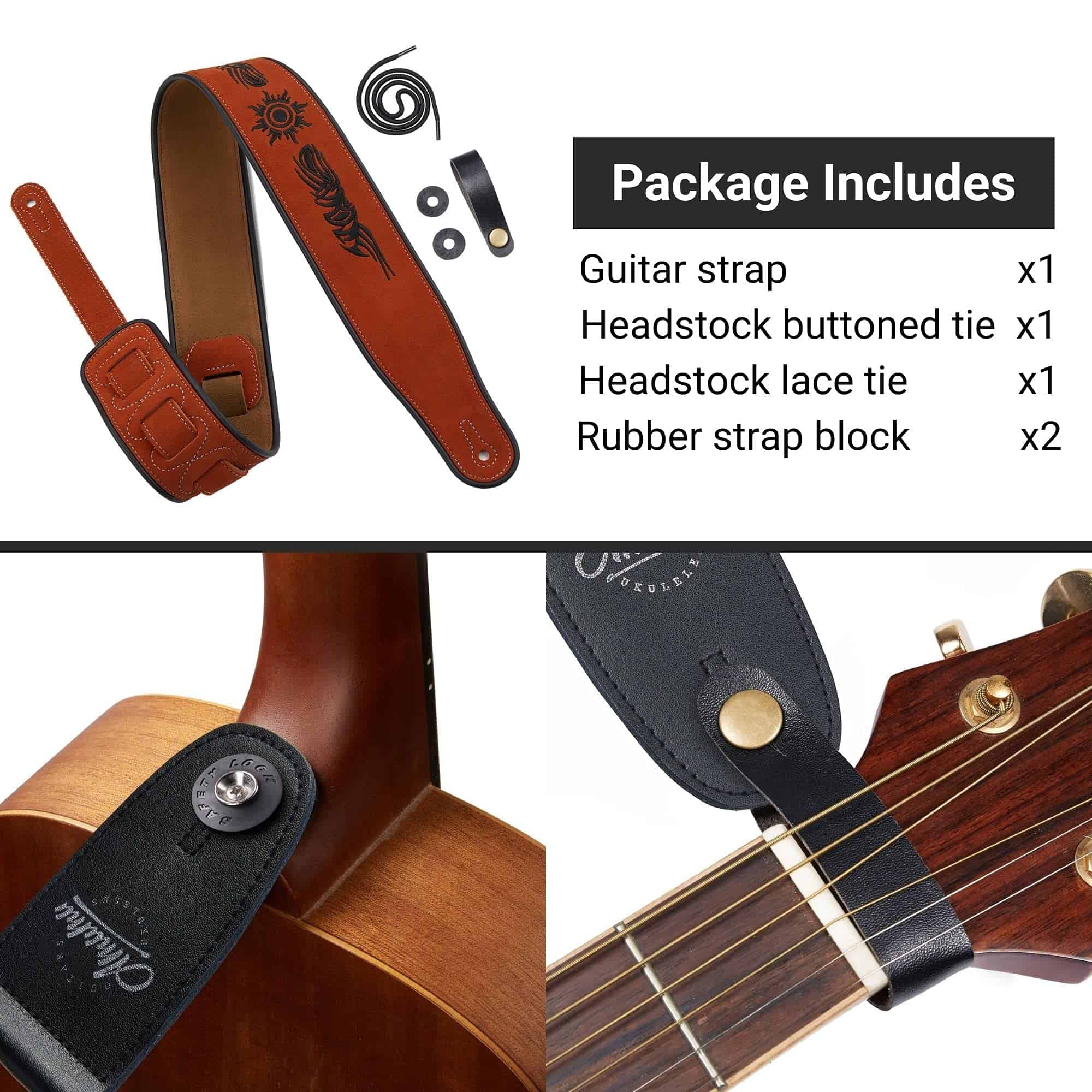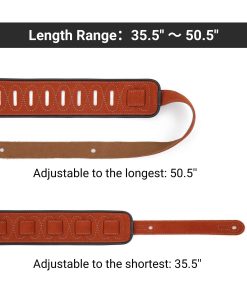 Esta correa de guitarra tiene una longitud ampliamente ajustable de 41″ a 50.5″ (botón a botón) para adaptarse a la mayoría de los músicos. Una doble capa de cuero de gamuza hace que la correa sea más duradera y cómoda. La capa superior está bordada con un patrón de tótem. Si solo tiene un botón de correa inferior en su guitarra, ¡el botón de correa de cabeza incluido puede ayudarlo a obtener lo que necesita!
