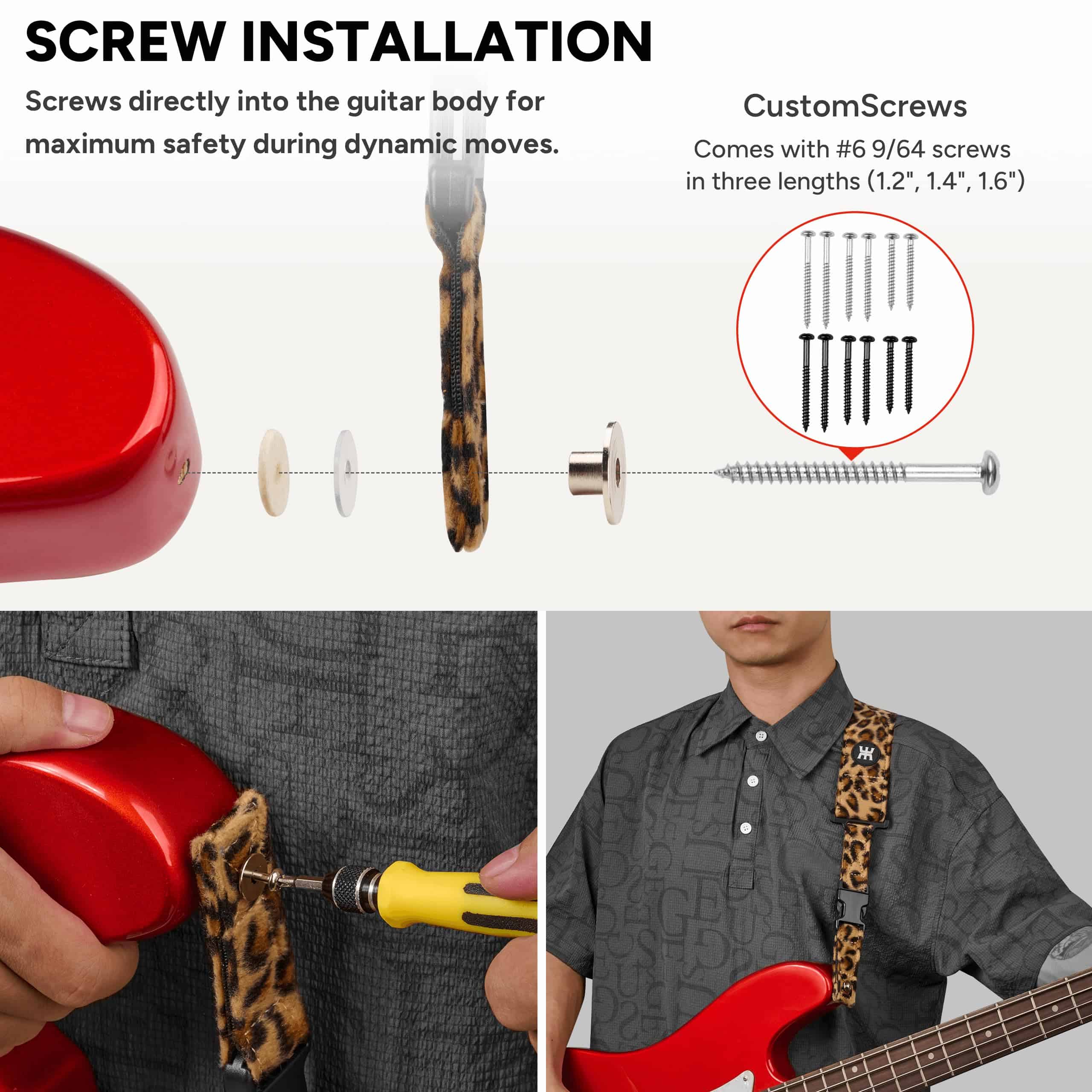 1. Fijación segura definitiva: Atornilla directamente en el cuerpo de la guitarra para una máxima seguridad durante actuaciones dinámicas y movimientos de alta energía como saltos grandes y giros de guitarra, utilizando una correa de terciopelo personalizada de 2″ con respaldo de algodón.