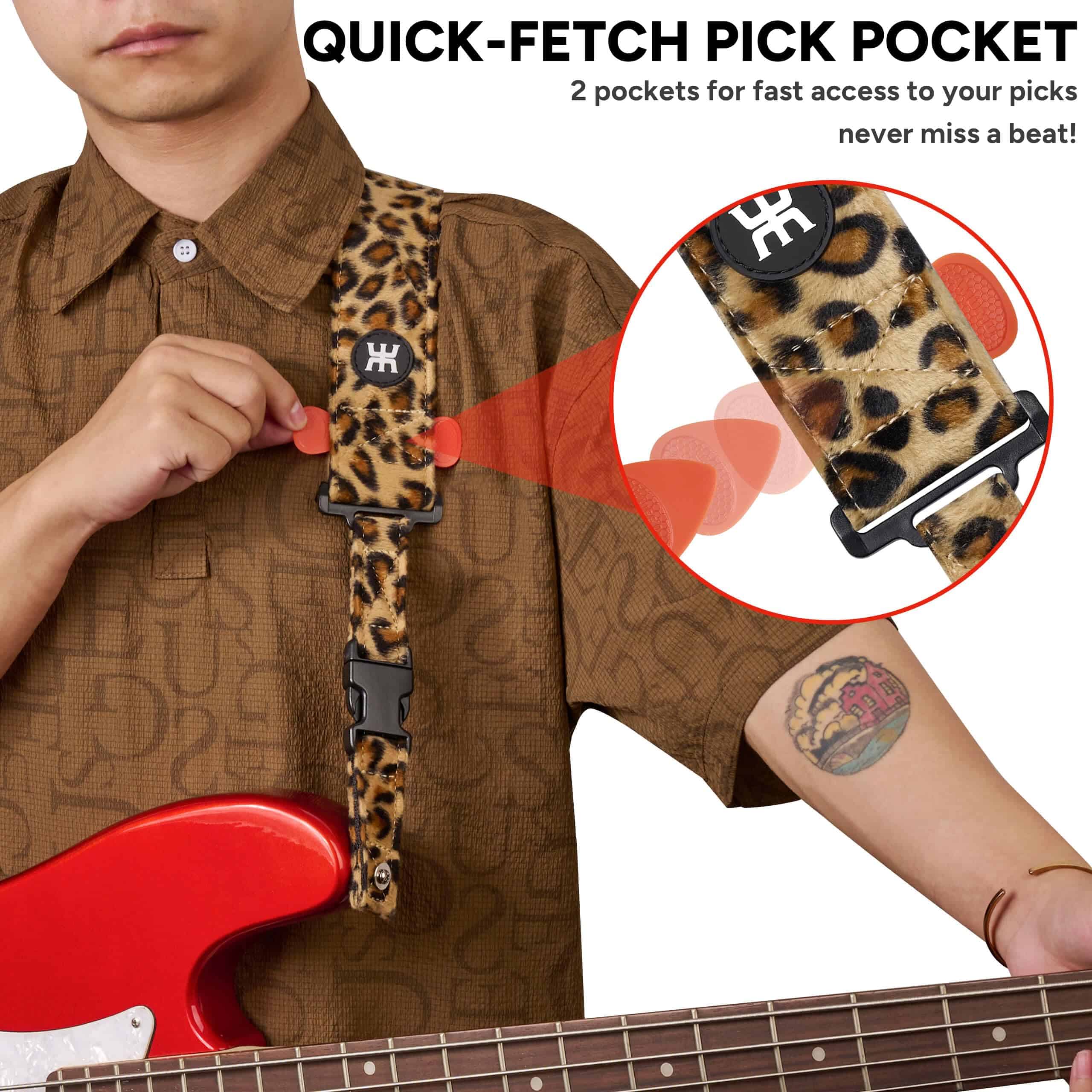 2. Soporte para púas de recuperación rápida: Dos soportes patentados de acceso rápido para un acceso rápido y conveniente a tus púas de guitarra, asegurando que siempre estés listo para tocar.