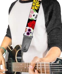 1. Correa de guitarra Buckle-Down – Calaveras de azúcar y flores negro/multicolor – 2″ de ancho – 29-54″ de largo