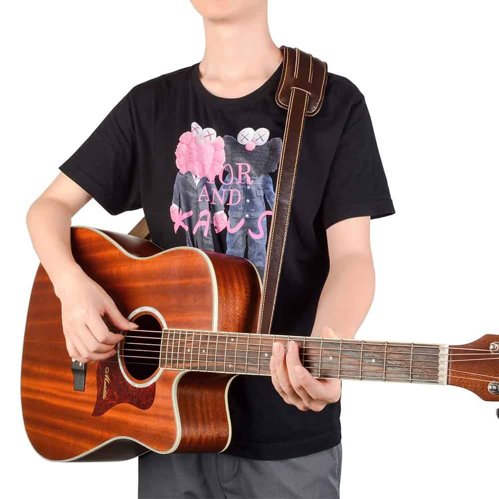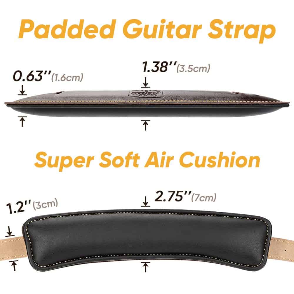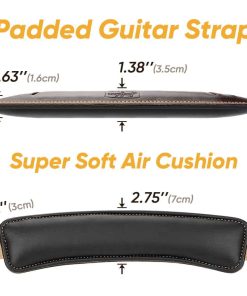 2. Correa Acolchada Suave: El ancho de la correa de guitarra acolchada (3,5 cm) es de 7 cm (2,75 pulgadas), lo que puede ayudar a distribuir el peso de tu guitarra y reducir la presión de tus hombros y espalda al máximo. El ancho de la parte estrecha de la correa de guitarra marrón es de 3 cm (1,2 pulgadas), que es súper duradero y no es fácil de desgastar.