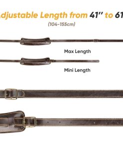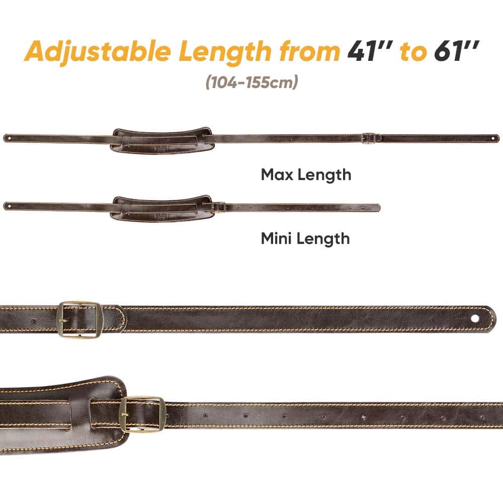 3. Ajuste para la Mayoría: Esta correa de guitarra tiene una hebilla metálica ajustable que es fácil de ajustar (Nota: Libera la hebilla metálica antes de ajustar la longitud). La correa de guitarra de cuero marrón tiene una longitud ajustable extra larga de 104 cm a 155 cm (41 pulgadas a 61 pulgadas), que puede adaptarse a la mayoría de los guitarristas.