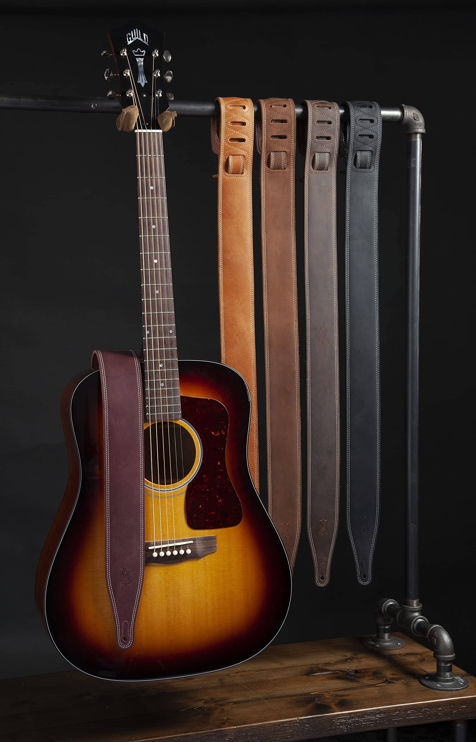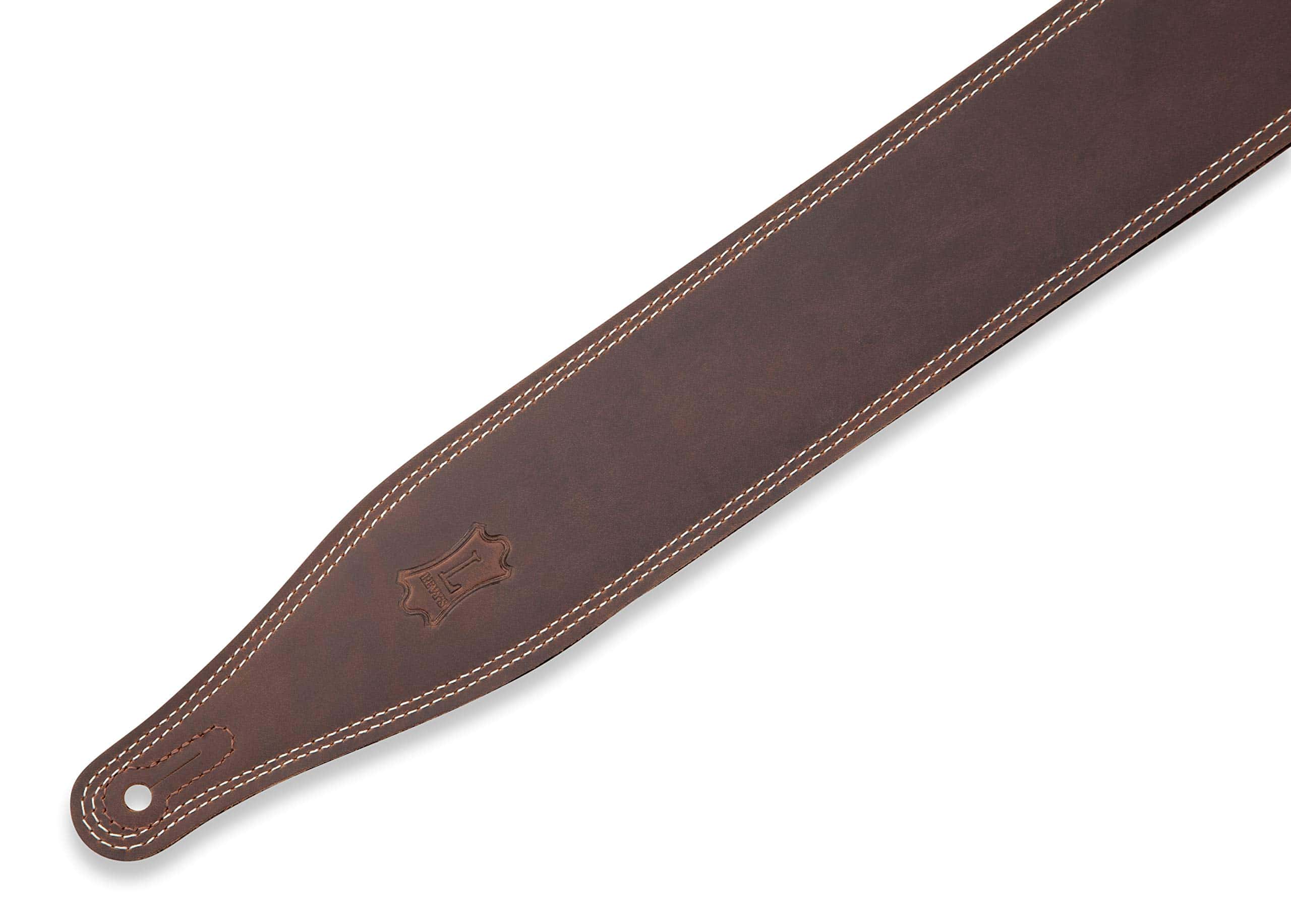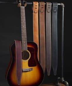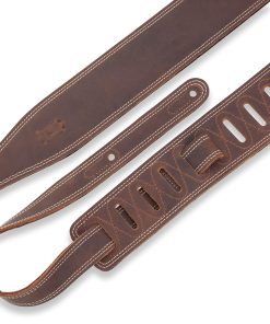 Correa de guitarra de cuero de 2 1/2″ con respaldo de suave cuero para ropa. Correa de 2 capas ‘Butter’ – Doble costura blanca alrededor del cuerpo y la cola. Ajustable – 41″ a 55″. Parte superior de cuero Pull Up de marrón oscuro con respaldo de cuero para ropa de marrón oscuro que envejece bien con el uso.