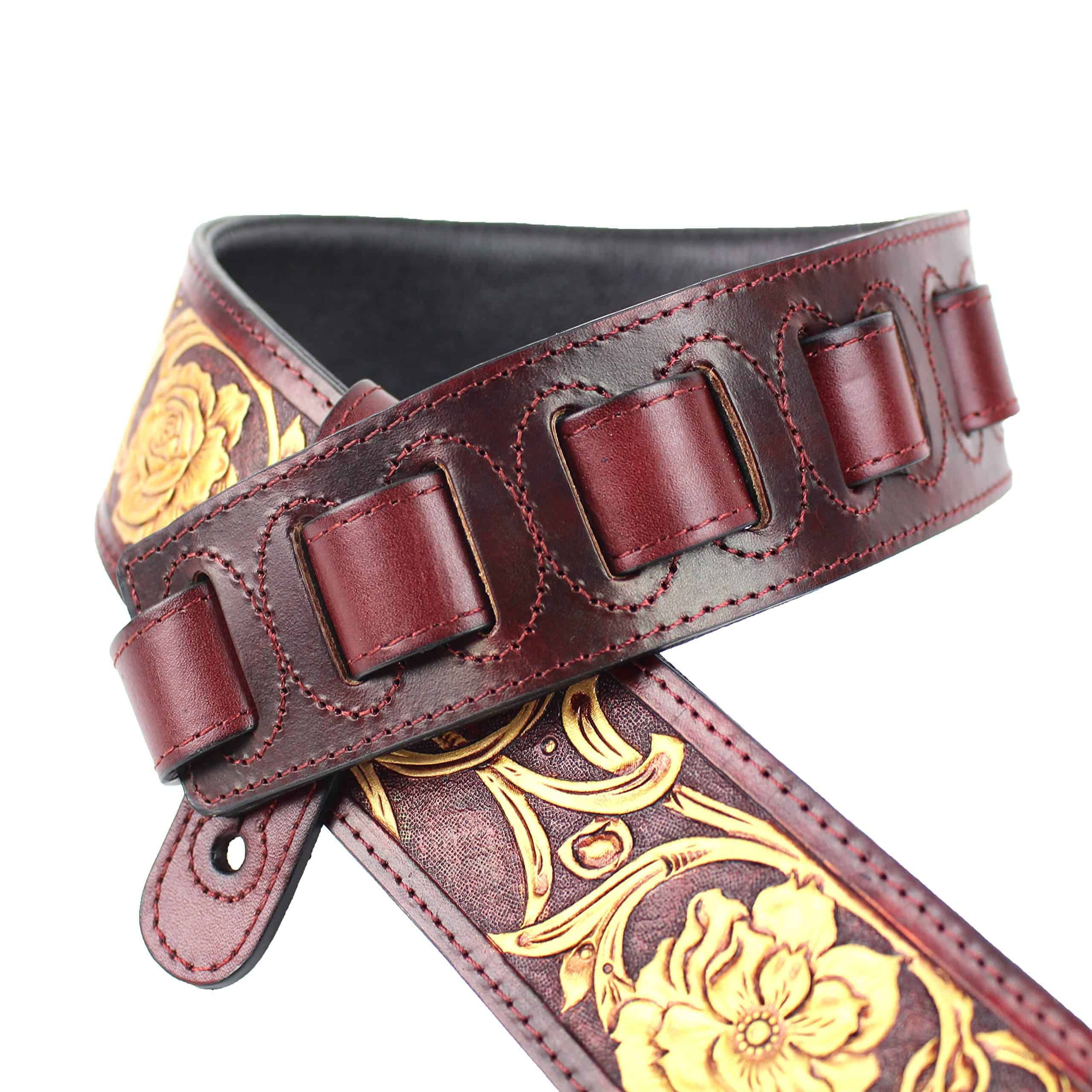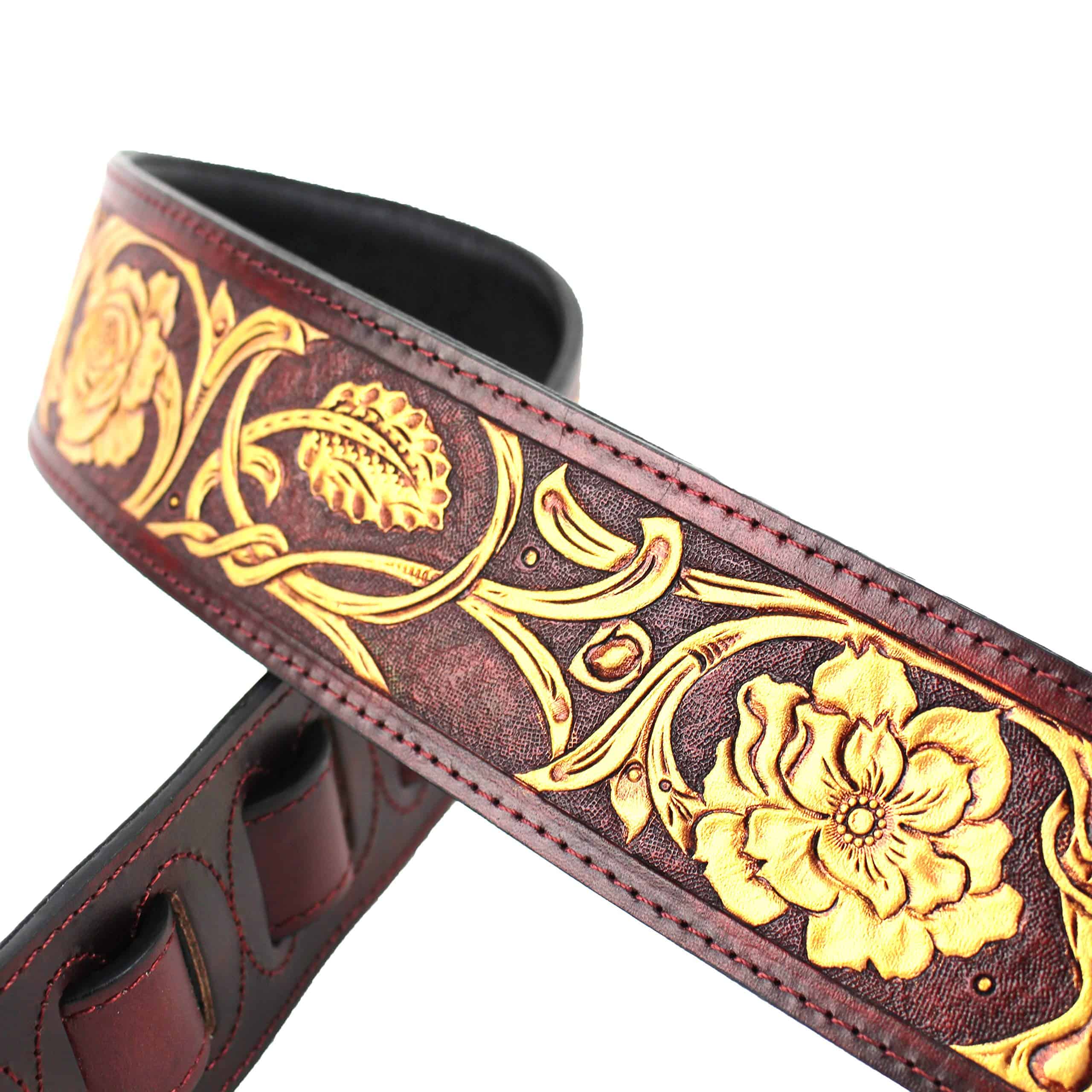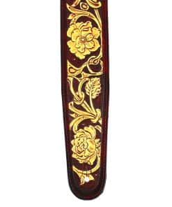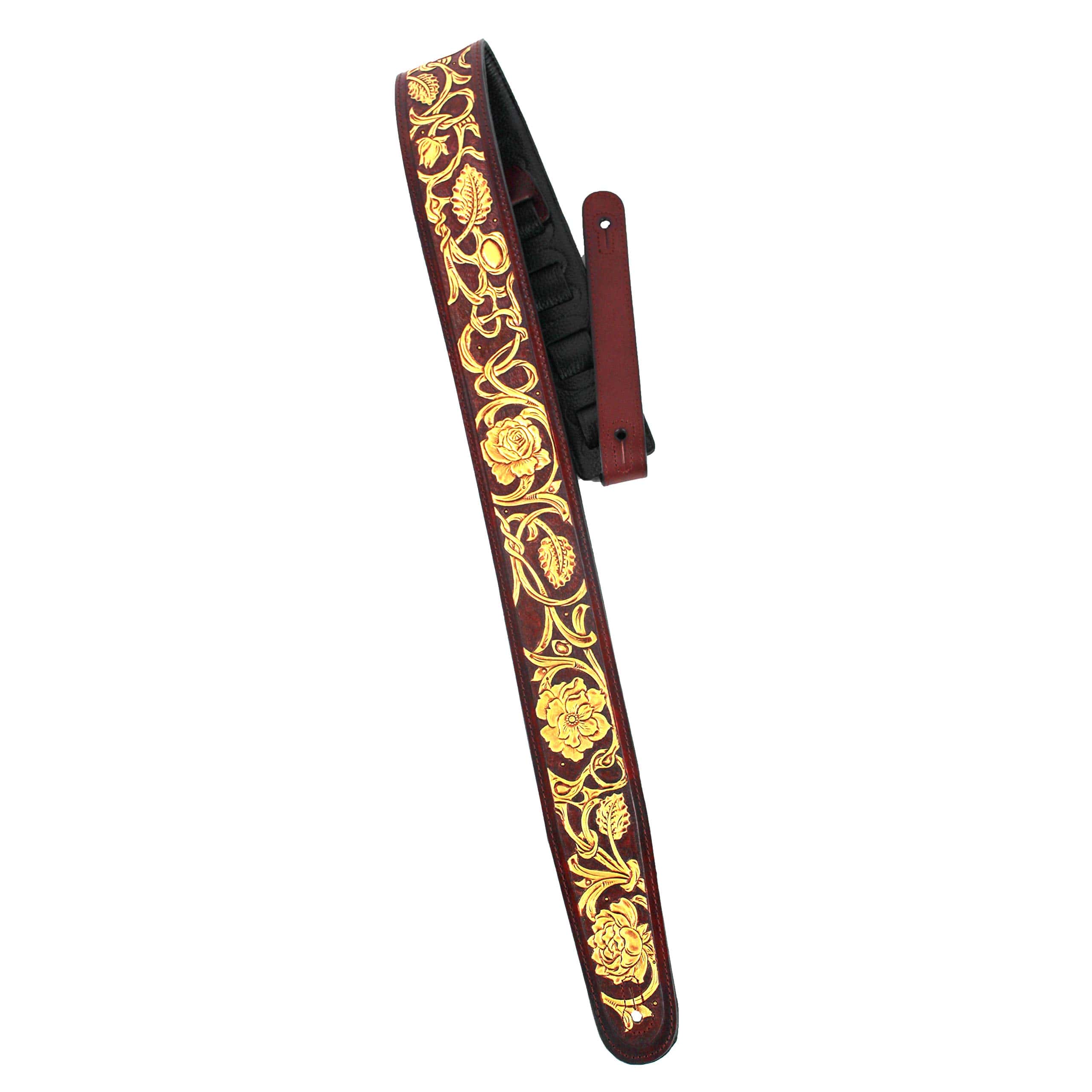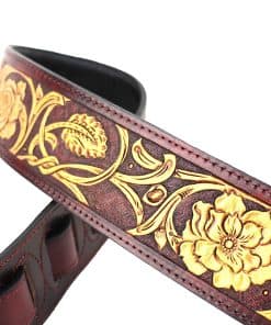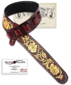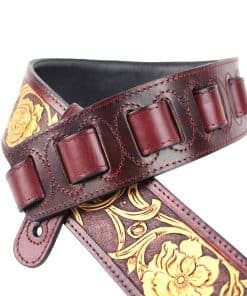 Correa de guitarra premium de cuero rojo granate Walker and Williams LHR-18 con un elegante grabado floral dorado brillante, ideal para guitarras acústicas, eléctricas y bajos. Esta correa es ajustable de 39″ a 56″ y tiene una anchura de 50″ para mayor comodidad. La parte trasera está hecha de cuero premium acolchado para una sensación suave en el hombro. Los extremos de cuero granate rojo brillante de grano superior semi brillante le dan un toque elegante y duradero. La parte superior de cuero tallado de longitud completa hace que esta correa sea única y llamativa. ¡Obtén la máxima comodidad y estilo con esta increíble correa de guitarra!