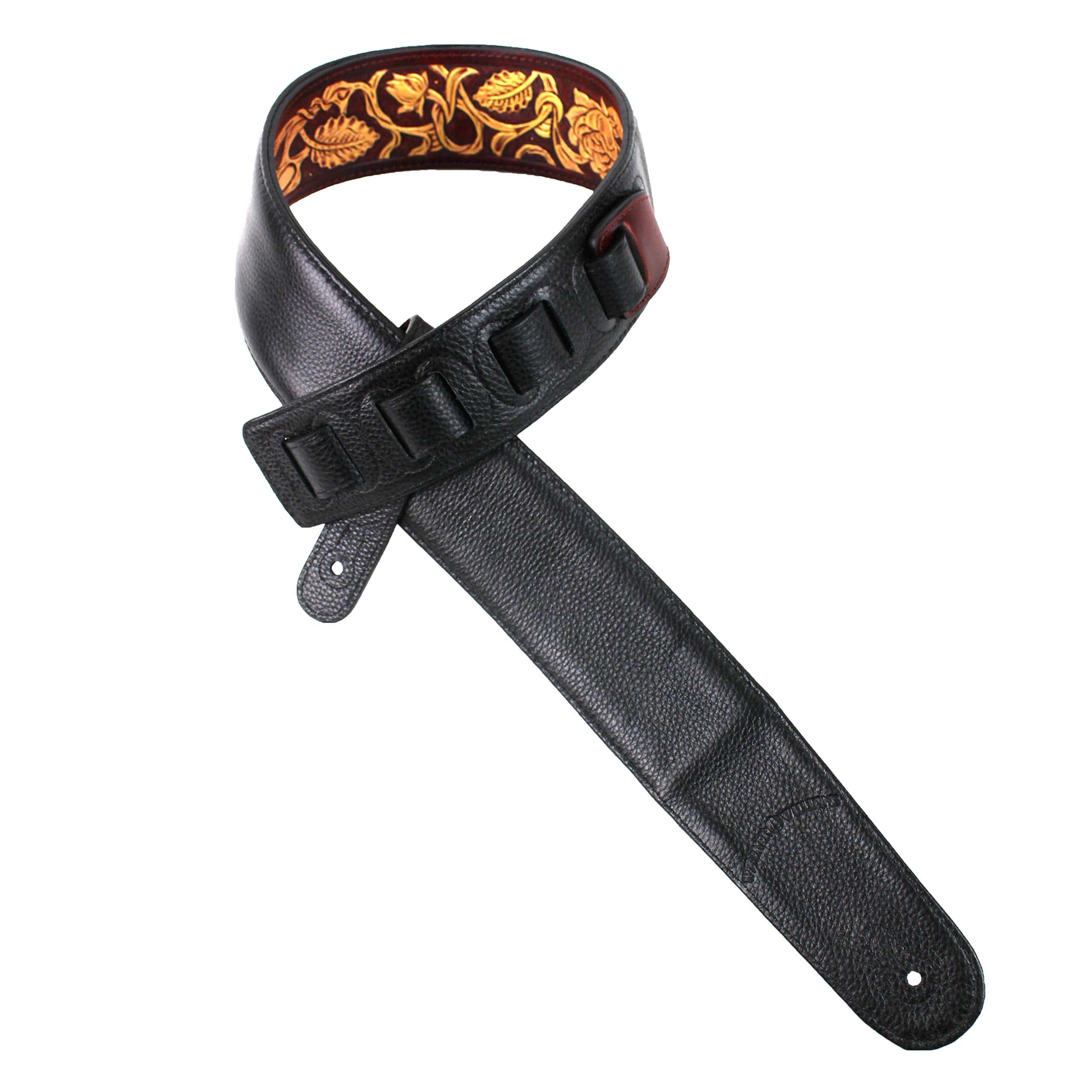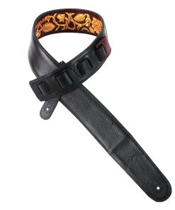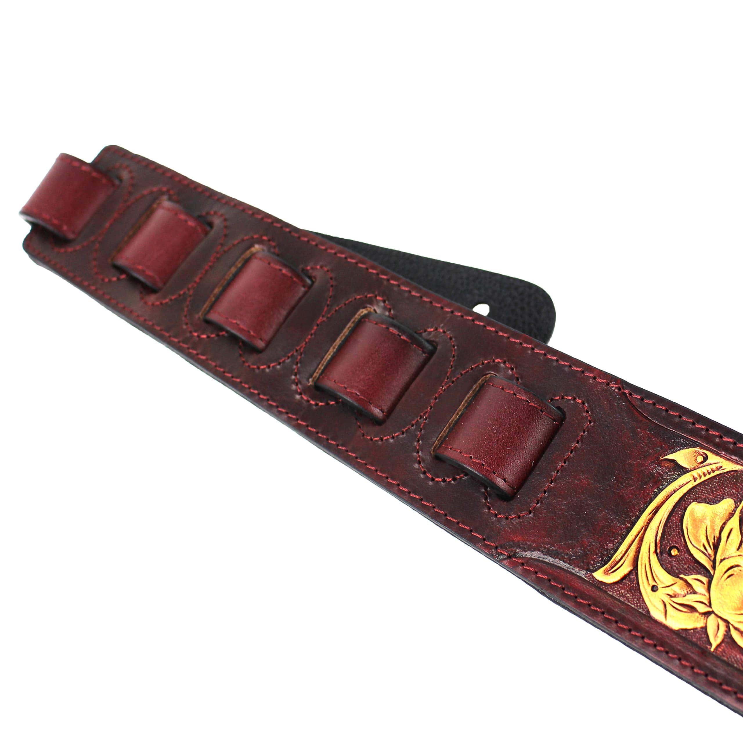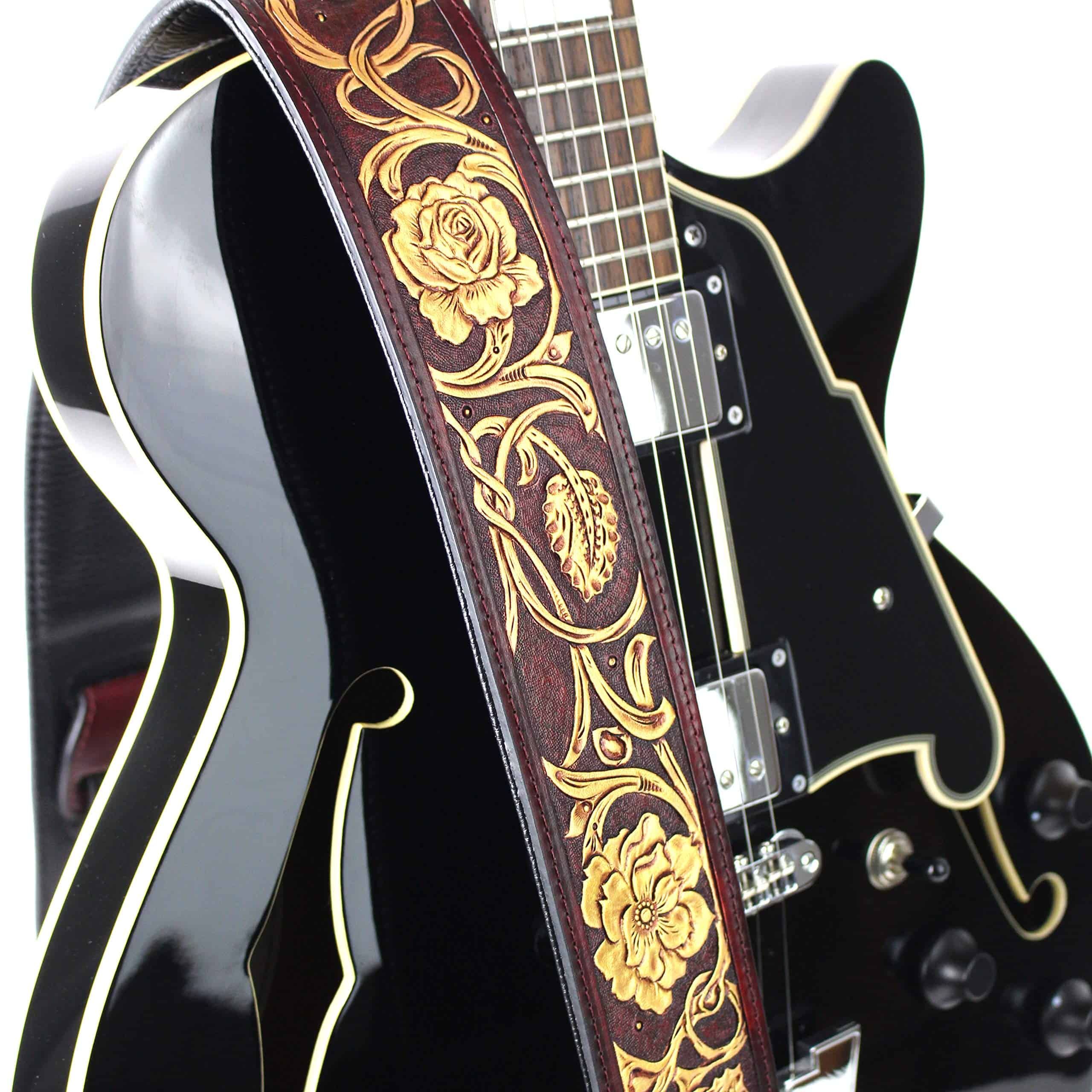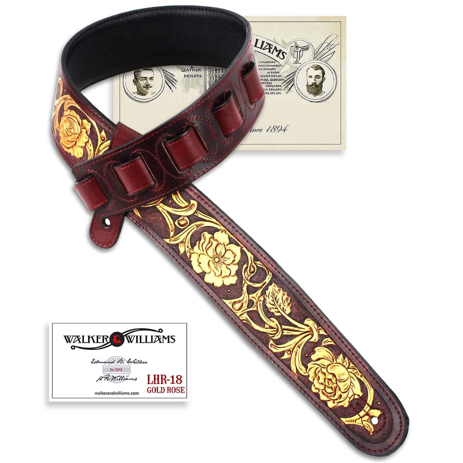 Correa de guitarra premium de cuero rojo granate Walker and Williams LHR-18 con un elegante grabado floral dorado brillante, ideal para guitarras acústicas, eléctricas y bajos. Esta correa es ajustable de 39″ a 56″ y tiene una anchura de 50″ para mayor comodidad. La parte trasera está hecha de cuero premium acolchado para una sensación suave en el hombro. Los extremos de cuero granate rojo brillante de grano superior semi brillante le dan un toque elegante y duradero. La parte superior de cuero tallado de longitud completa hace que esta correa sea única y llamativa. ¡Obtén la máxima comodidad y estilo con esta increíble correa de guitarra!