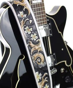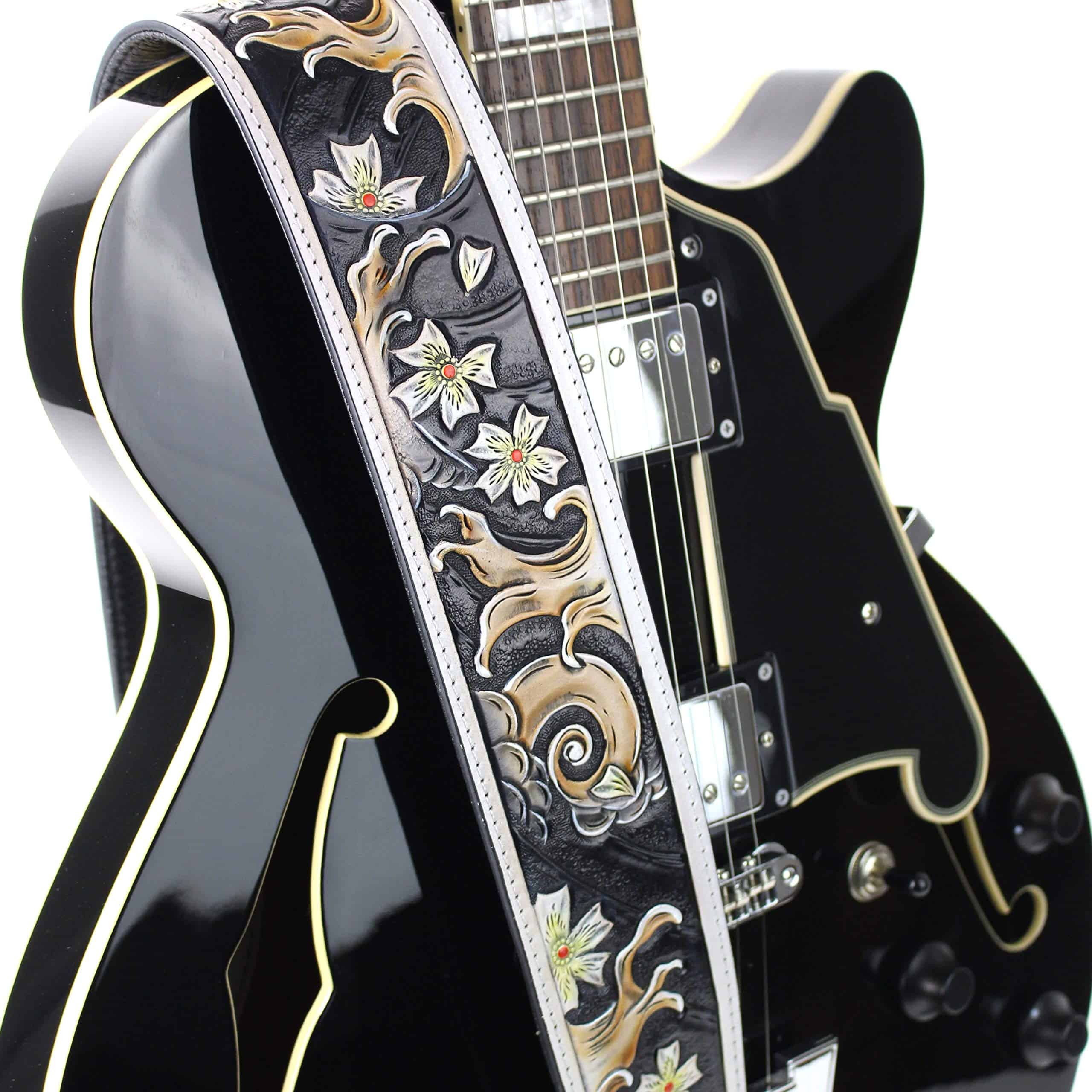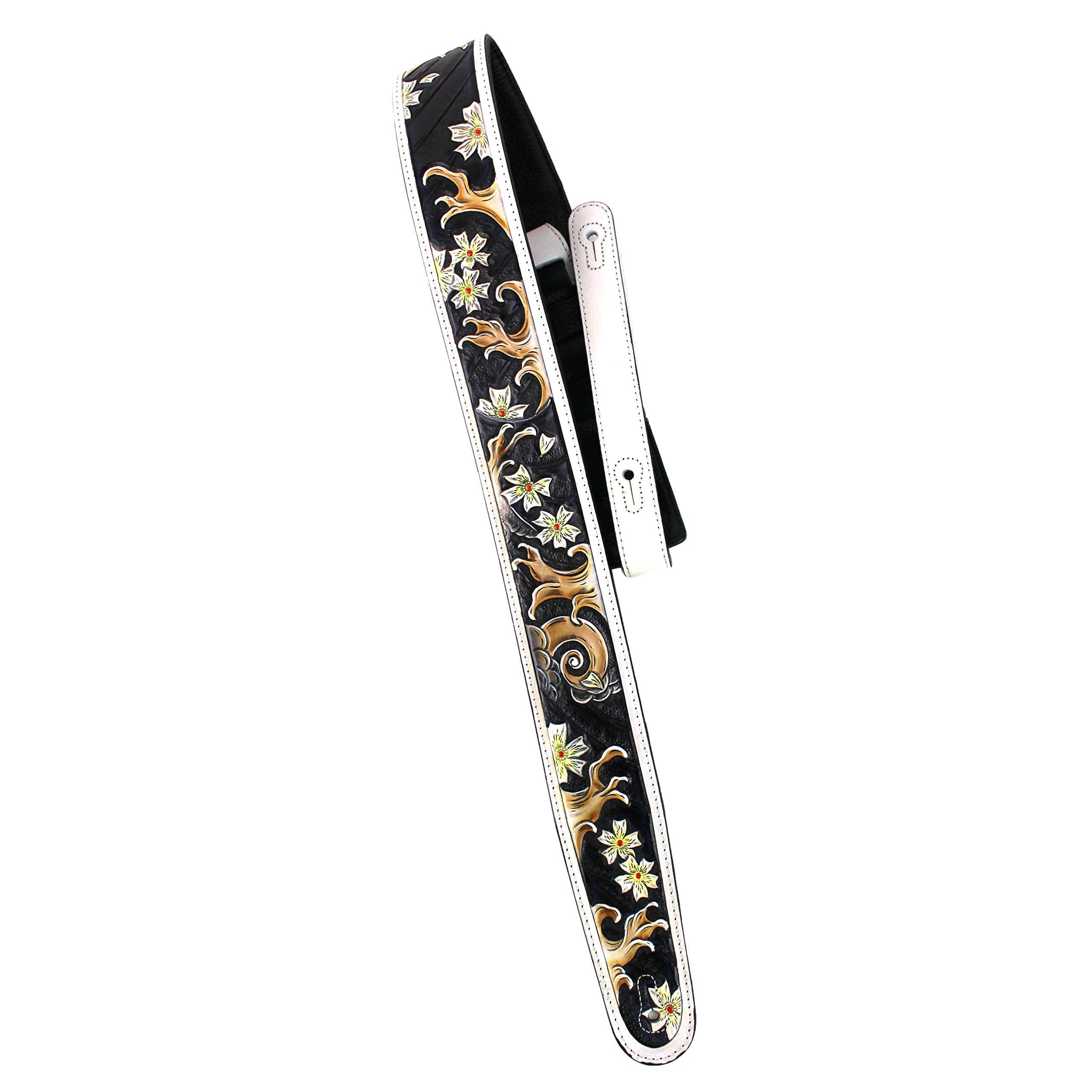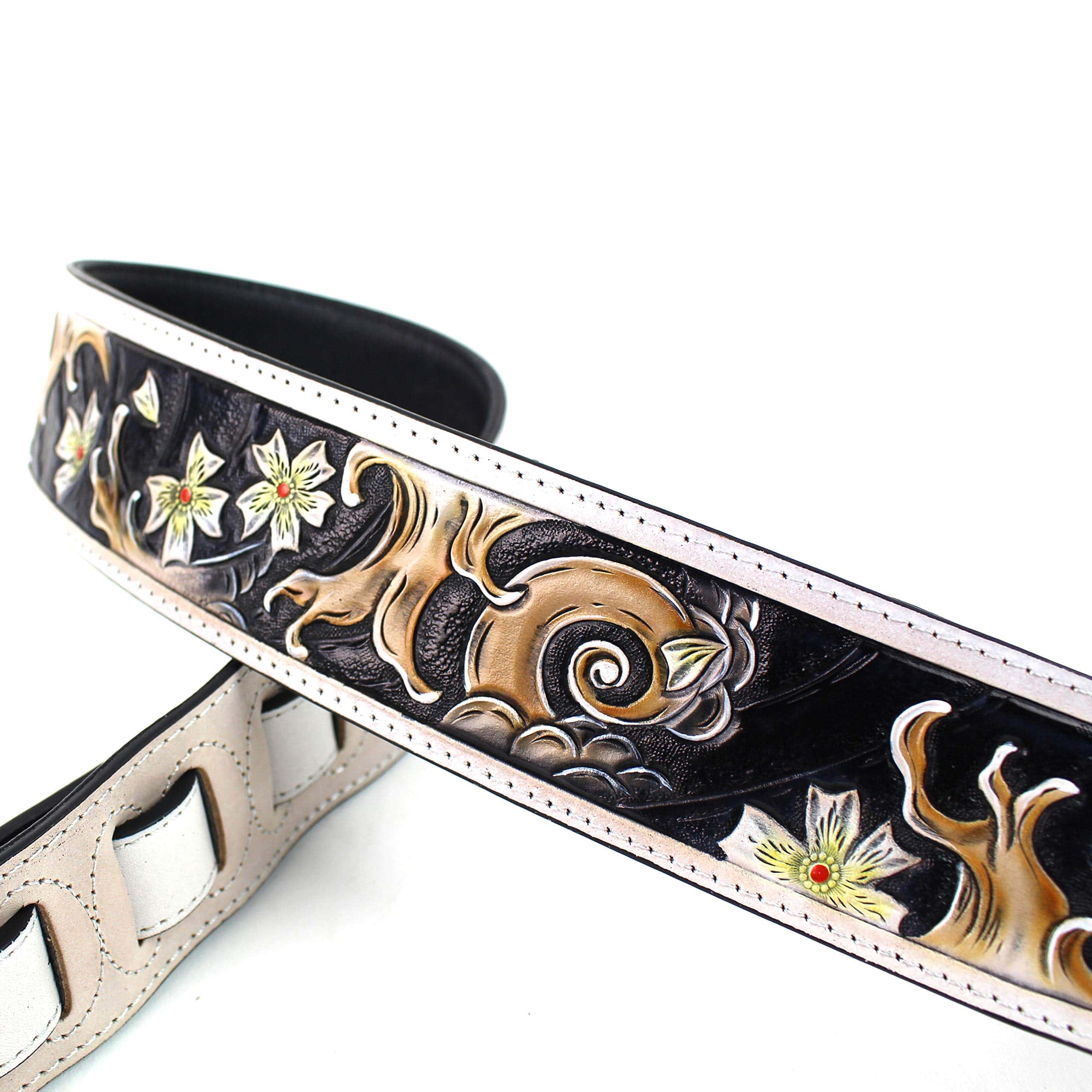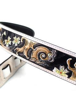 Acabamos de lanzar la nueva Serie de Artistas LHR. Combinando cuero tallado de grano superior con artesanía en cuero, hemos creado el estilo de tallado japonés Sumi-E. Estas correas tienen bordes negros brillantes con una pieza de cuero tallado premium de longitud completa. Hemos añadido un respaldo acolchado de cuero premium para mayor comodidad durante mucho tiempo. Con colores que van desde marrones sutiles hasta azules y blancos vibrantes, estas correas seguramente se combinarán bien con una gran variedad de acabados de guitarra y destacarán en o fuera del escenario. Correa de cuero premium blanco y negro antiguo LHR-26 con escena de ola Sumi-E y flores de cerezo Respaldo de cuero acolchado premium muy cómodo. Parte superior de cuero tallado de grano completo Escena de ola japonesa tallada Fondo de diseño negro Costuras superiores blancas Bordes negros Ancho de 2.50″ Ajustable de 39″ a 56″