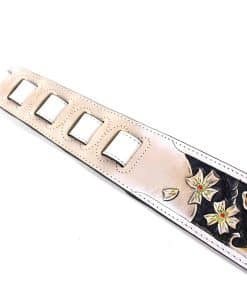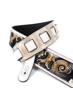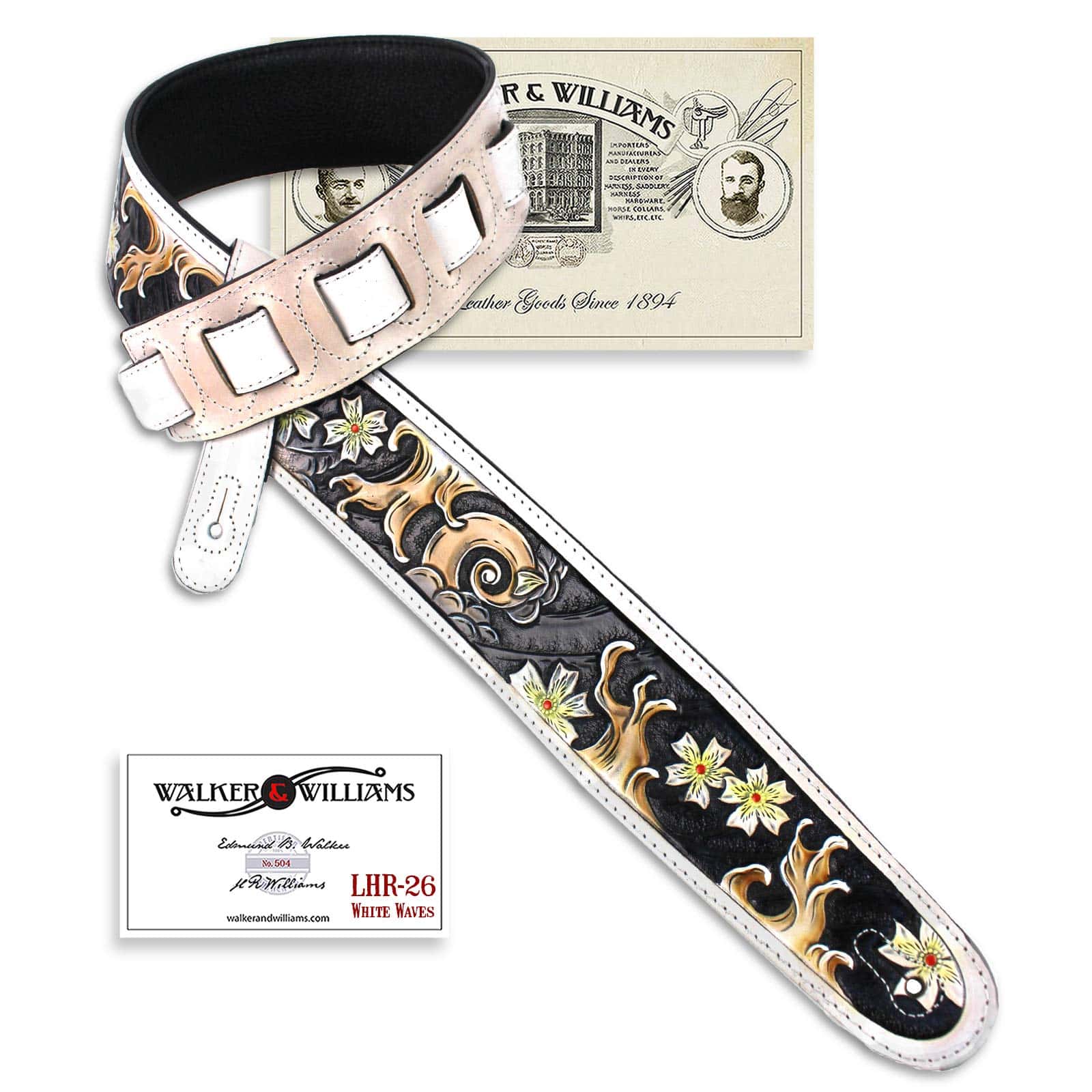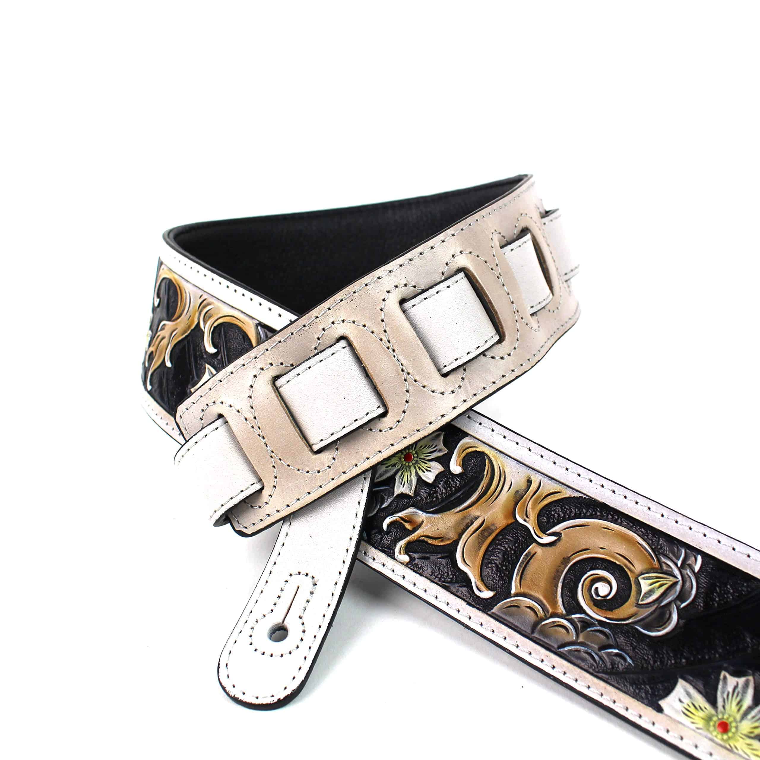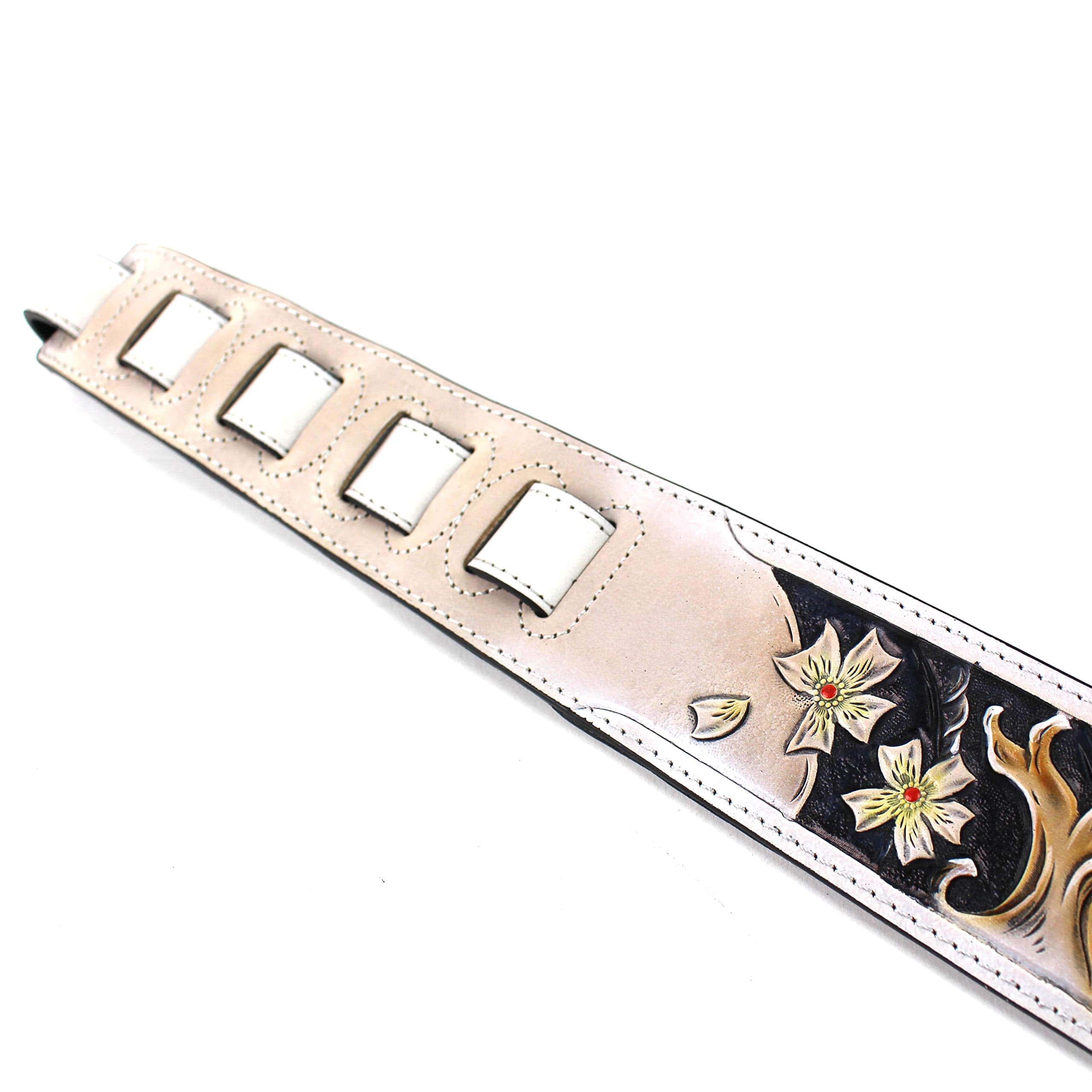 Acabamos de lanzar la nueva Serie de Artistas LHR. Combinando cuero tallado de grano superior con artesanía en cuero, hemos creado el estilo de tallado japonés Sumi-E. Estas correas tienen bordes negros brillantes con una pieza de cuero tallado premium de longitud completa. Hemos añadido un respaldo acolchado de cuero premium para mayor comodidad durante mucho tiempo. Con colores que van desde marrones sutiles hasta azules y blancos vibrantes, estas correas seguramente se combinarán bien con una gran variedad de acabados de guitarra y destacarán en o fuera del escenario. Correa de cuero premium blanco y negro antiguo LHR-26 con escena de ola Sumi-E y flores de cerezo Respaldo de cuero acolchado premium muy cómodo. Parte superior de cuero tallado de grano completo Escena de ola japonesa tallada Fondo de diseño negro Costuras superiores blancas Bordes negros Ancho de 2.50″ Ajustable de 39″ a 56″