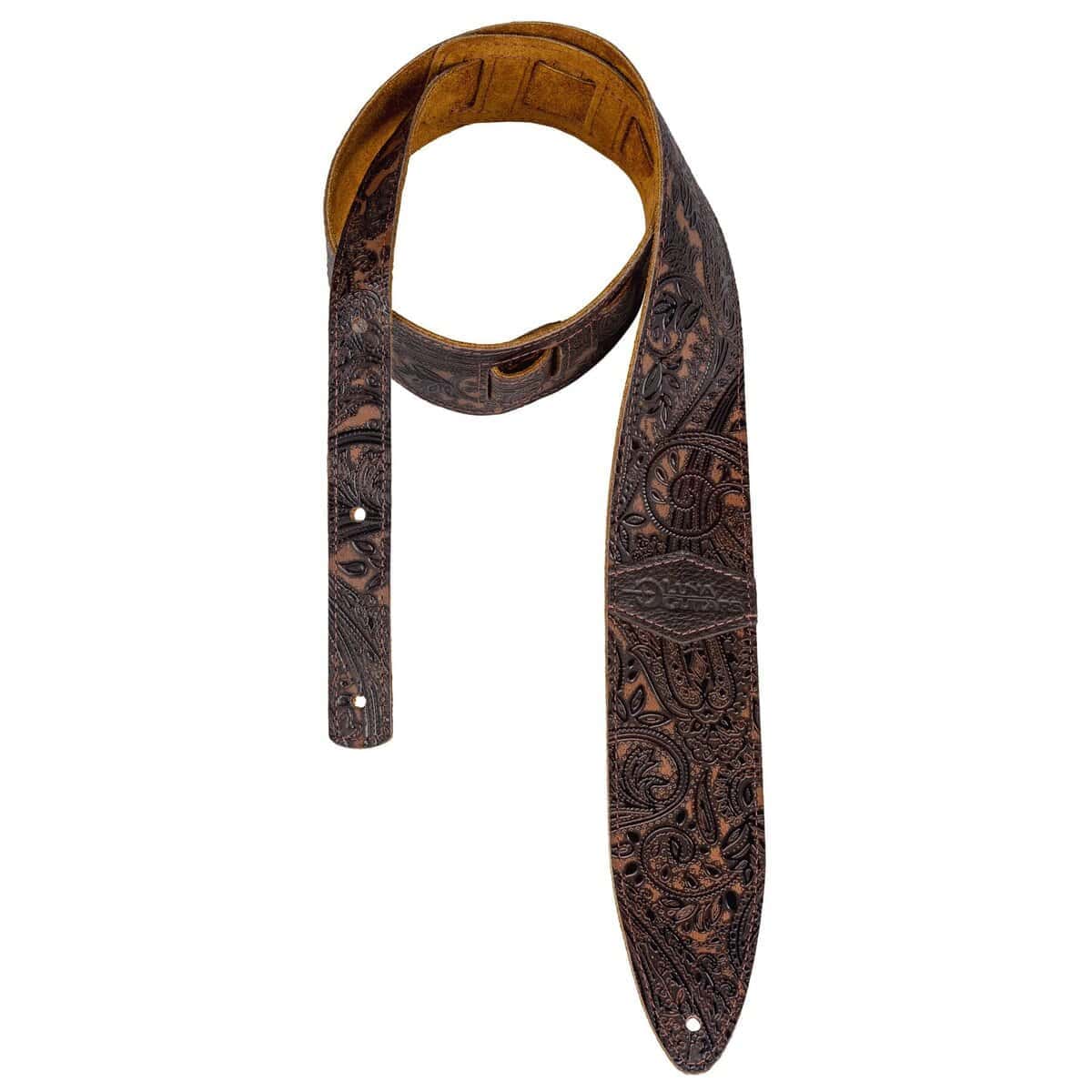 Luna Guitars Leather Paisley Brown Guitar Strap, STRAP LUNA LTH SLDR BR La correa de paisley de Luna está hecha de cuero repujado con un diseño paisley ornamentado en marrón chocolate en la parte frontal tostada con reflejos brillantes. Un distintivo badge con el logo de Luna en marrón oscuro está cosido en la parte delantera de la correa. La correa Paisley es el complemento perfecto para nuestro incrustado de Henna y tiene una parte trasera de gamuza de color beige natural para ayudar a asegurar la posición del instrumento mientras se toca. Cada correa tiene costuras reforzadas y una cola de cuero tradicional que se ajusta de 43 a 57. Hecho a mano por artesanos en los EE. UU.