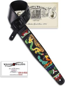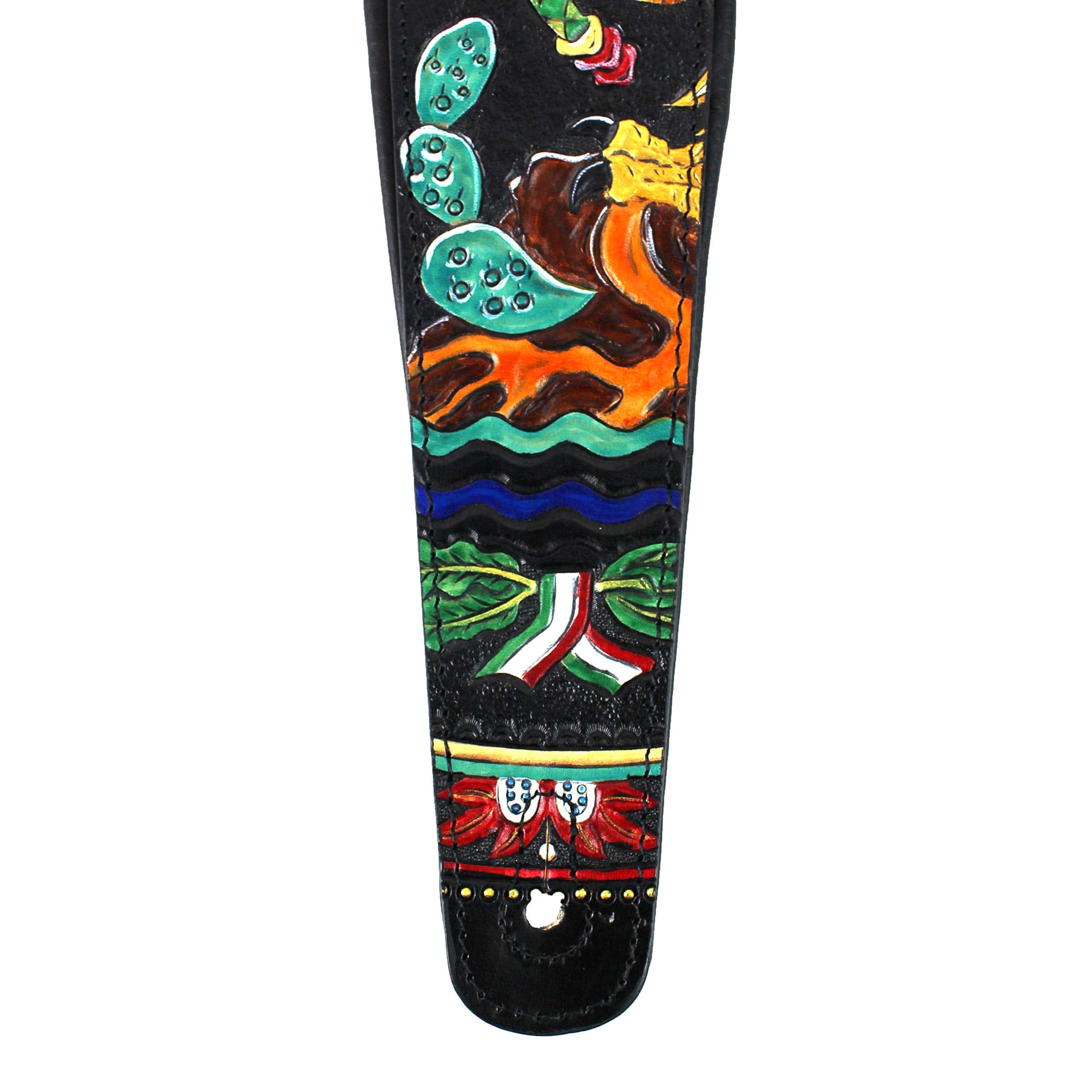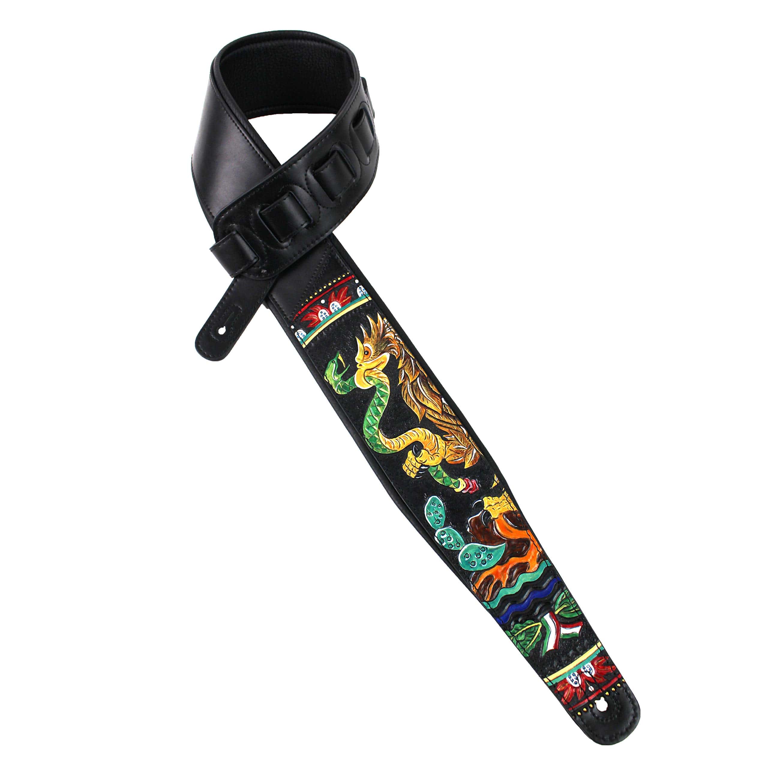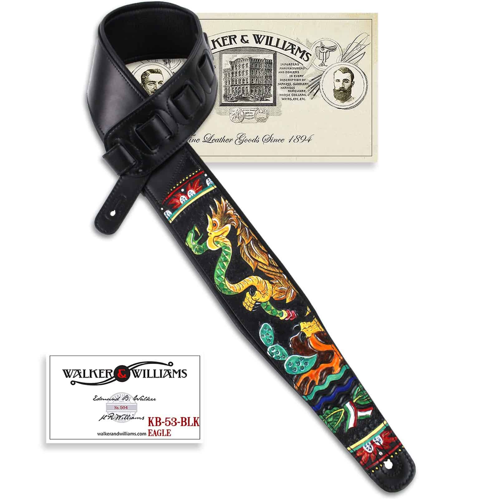 Nueva en nuestra línea World Heritage, nuestra serie Walker And Williams KB-53-BLK está hecha a mano con diseños clásicos y nuevos inspirados en países alrededor del planeta. Cada diseño incluye representaciones de arte y símbolos tradicionales de diferentes culturas. Hemos confeccionado cada correa con artesanía en cuero de alta calidad y pinturas detalladas. Creemos que todos deberían estar orgullosos de su herencia y queremos que puedan mostrarla en sus queridas guitarras. Estamos muy contentos con los diseños y el trabajo que hemos realizado en estas correas. Estamos seguros de que también estarás feliz con estos nuevos modelos que tenemos para ti. Correa negra KB-53-BLK con diseño de águila y serpiente azteca en cuero grabado negro, cómoda espalda de cuero acolchado, diseño vibrante hecho a mano, fondo negro semibrillante, costuras a juego, 3″ de ancho, nariz cónica larga, ajustable de 40″ a 55″